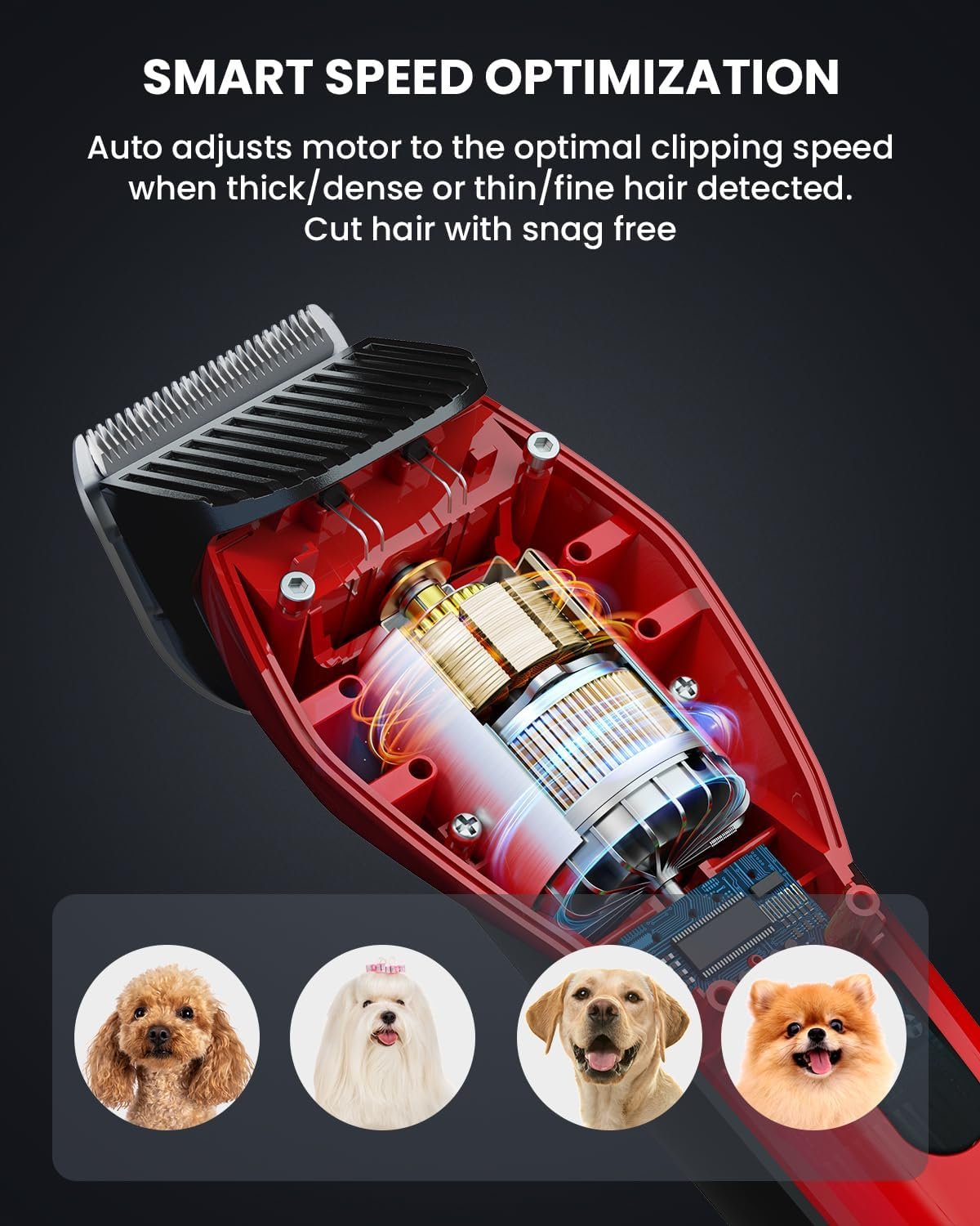 【Foolproof Clipping with One Click】 Just click on the SMART button, the smart pet clippers for grooming will do the rest of the job for you. DogCare’s original Smart Mode adjusts clipping speed intelligently for different hair types, different coat zones, and different hair lengths. Automatically fast for thick and dense hair, and gentle for thin and fine hair. Friendly to every newbie home groomer.