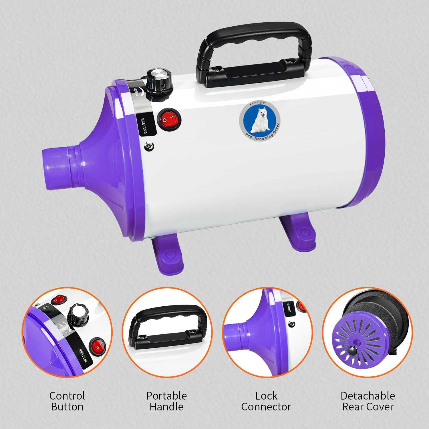 Dog Dryer, Pet Grooming Hair Dryer – Dog Hair Dryer with Adjustable Temperature and Speed for Pet Grooming,with Pet Brush, Pet Towel, 4 Different Nozzles (White Purple)