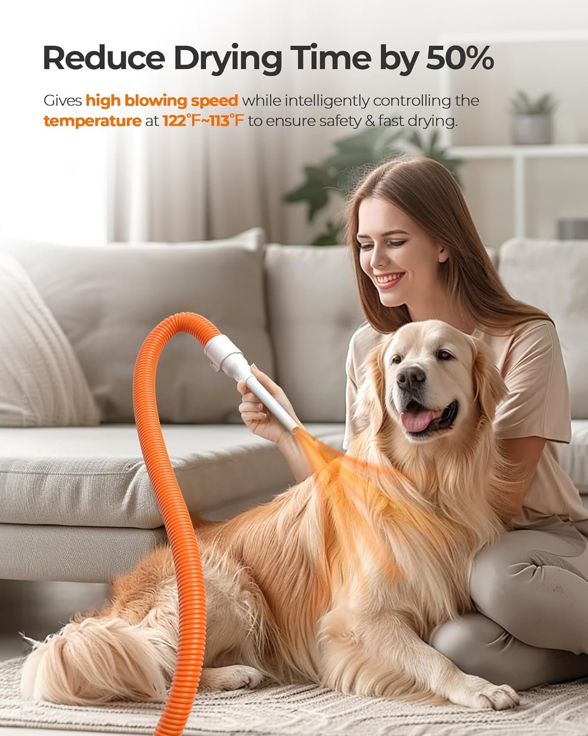🔆🌡️【Comfortable and Safe Drying Experience】Our grooming kit features an smart thermostat system that maintains a temperature range of 122℉ to 113℉. The optimal temperature helps prevent overheating while effectively drying your pet and ensures a fast & safe drying process. With adjustable 3 blowing speeds, you can customize the airflow to suit your pet’s comfort level. Say goodbye to wet and uncomfortable pets after bathing!
