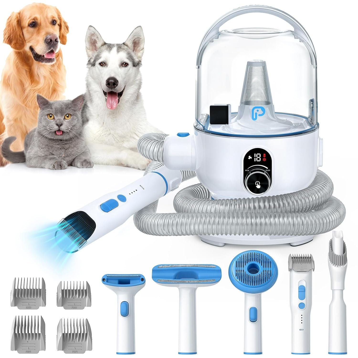 5 IN 1 PRO PET GROOMING KIT: This pet grooming kit with vacuum comes with 5 grooming tools. Use the daily grooming brush and the de-shedding tool to remove loose hair and eliminate tangles. The cleaning nozzle and cleaning brush can collect pet hair falling on the clothes, carpet and hard-to-reach areas. Make home grooming easy.