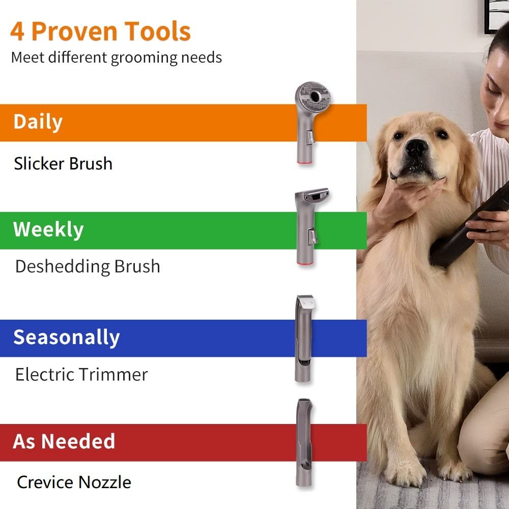 【Excellent Pet Hair Remover】This set comes with 4 attachments: The electric trimmer is used for seasonal trimming, deshedding brush for removing undercoat fur, slicker brush for daily combing, and crevice tool for collecting pet hair left on sofas & carpets.