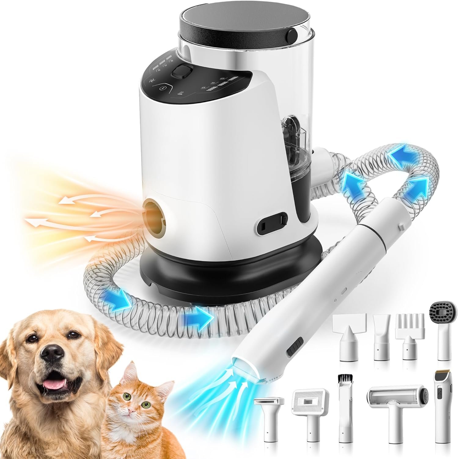 🐶【𝟑 𝐢𝐧 𝟏 𝐏𝐞𝐭 𝐆𝐫𝐨𝐨𝐦𝐢𝐧𝐠 𝐊𝐢𝐭 & 𝐕𝐚𝐜𝐮𝐮𝐦 & 𝐇𝐚𝐢𝐫 𝐃𝐫𝐲𝐞𝐫 】Multifunctional Hair Dryer + Pet Grooming Vacuum. Allows you to easily clip, wash, blow dry and trim your pet’s hair at home. The pet hair dryer has three different shapes of air vents to meet various blowing needs.