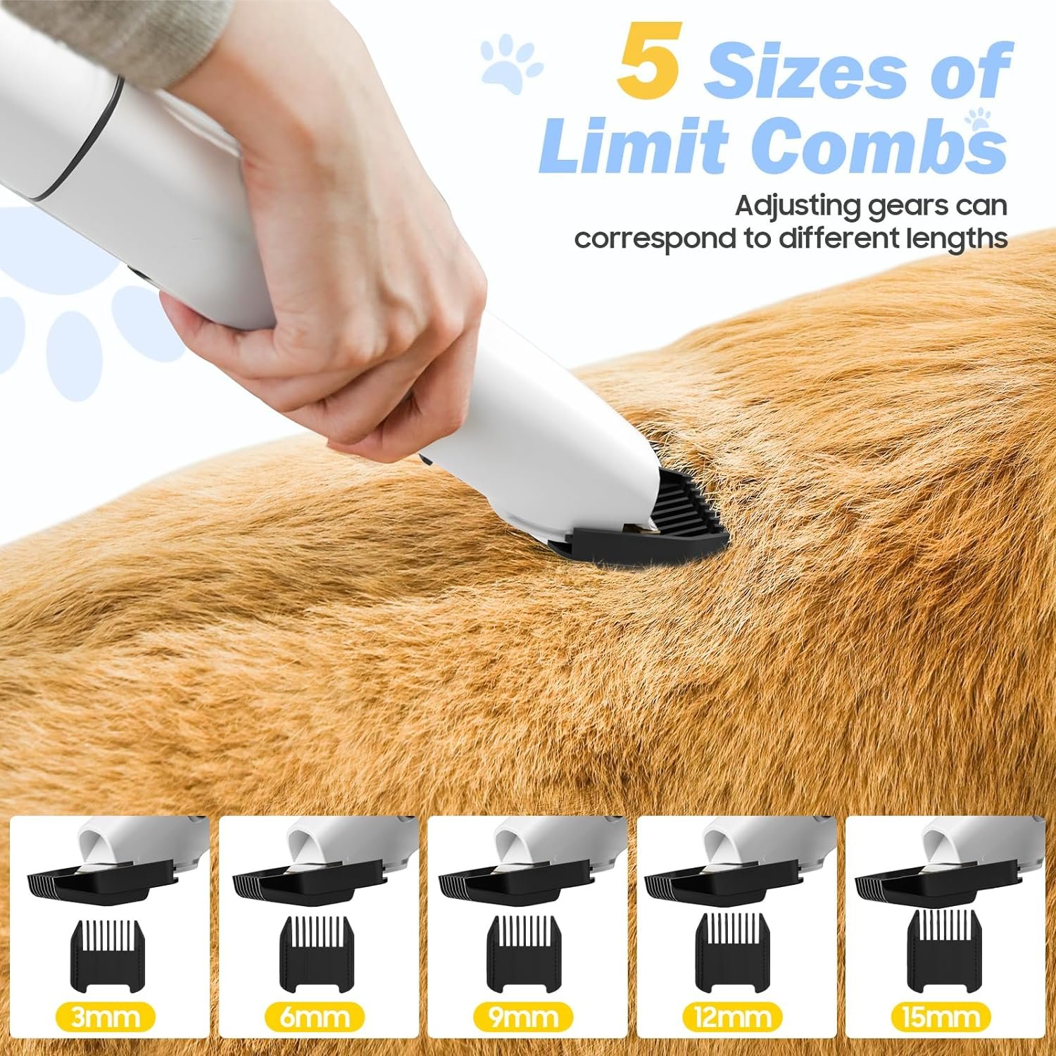 🐾【𝟓 𝐂𝐨𝐦𝐟𝐨𝐫𝐭𝐚𝐛𝐥𝐞 𝐆𝐮𝐚𝐫𝐝 𝐂𝐨𝐦𝐛】Adjustable trimming combs (3mm/6mm/9mm/12mm/15mm) for trimming different lengths of hair. The removable guide combs can be changed quickly and easily for increased versatility.