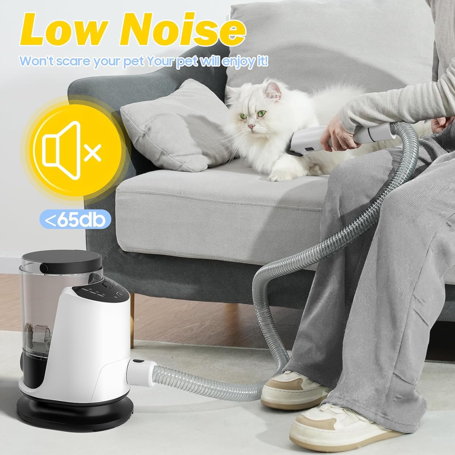 🐱【𝐋𝐨𝐰 𝐍𝐨𝐢𝐬𝐞 𝐃𝐞𝐬𝐢𝐠𝐧】Our pet grooming vacuum have a minimum noise level of less than 65 decibels, and we recommend brushing your pet’s coat with our brush before trimming it, treating your pet with a small snack and avoiding stressing your pet with the noise of the vacuum cleaner, which will undoubtedly make the pet grooming experience more enjoyable.