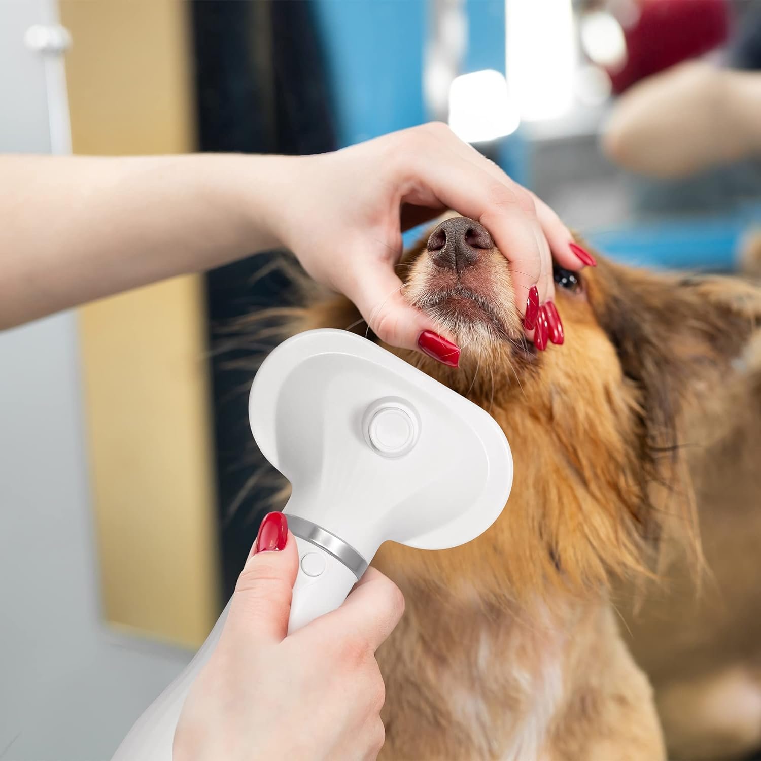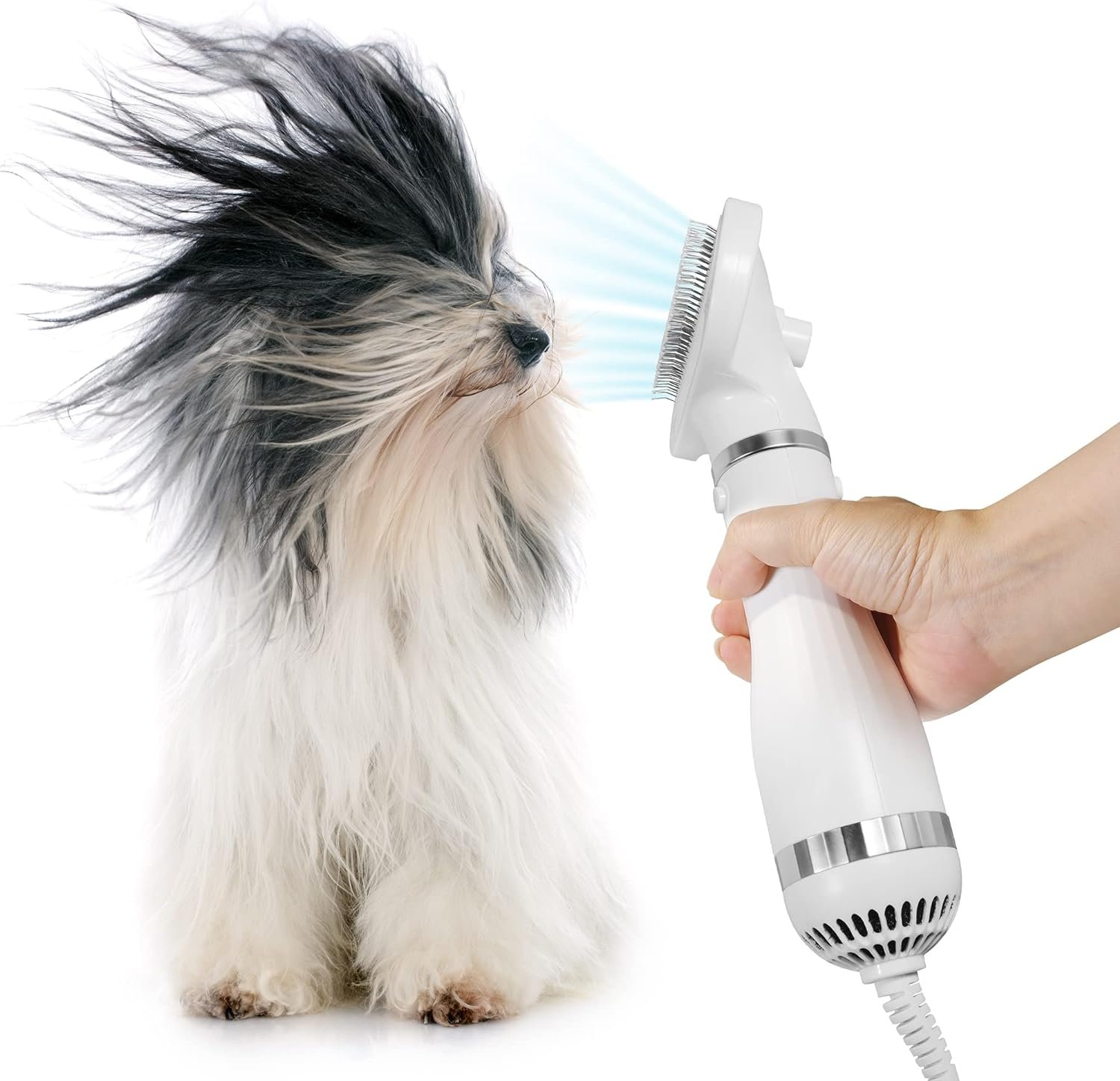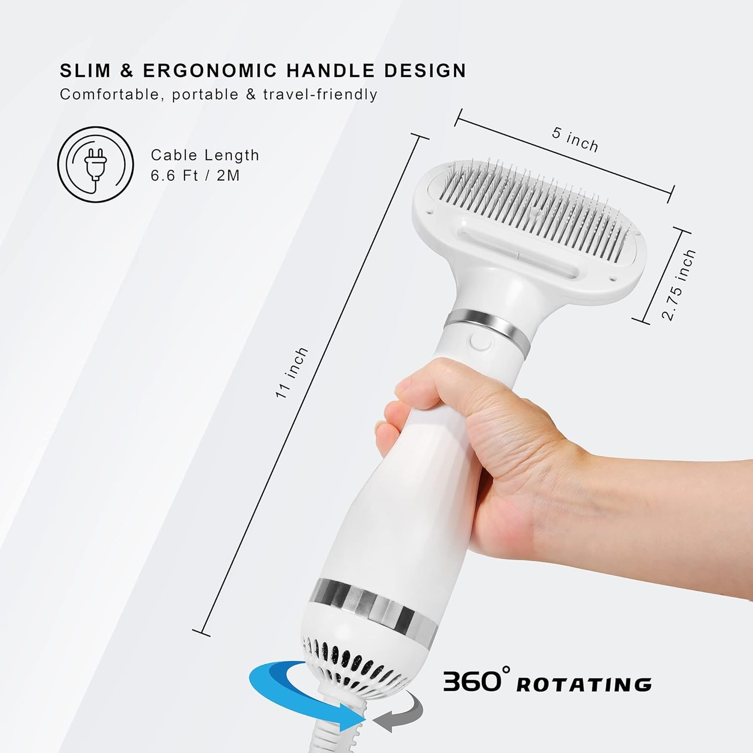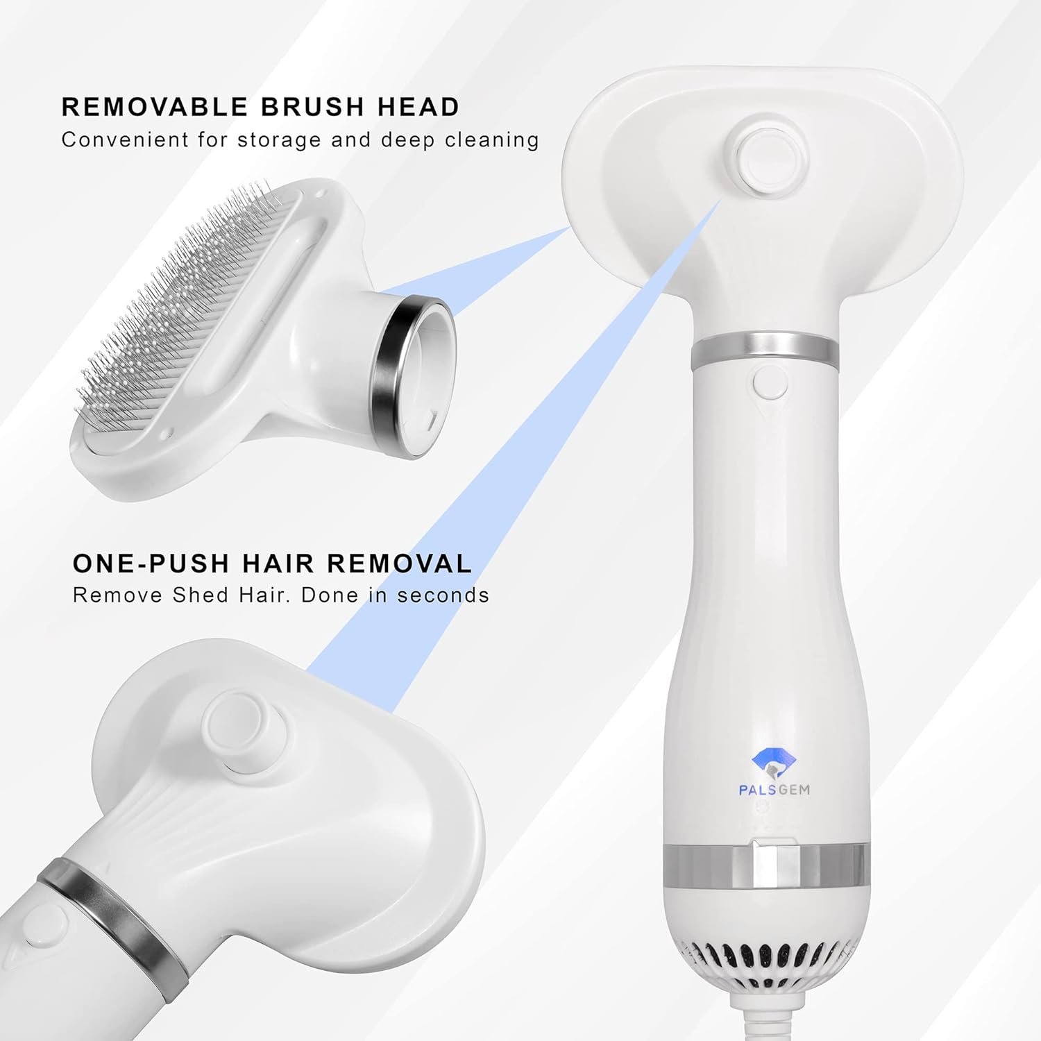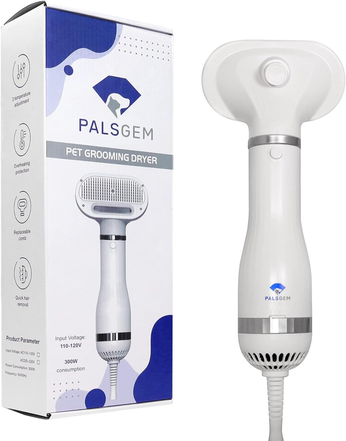 The pet hair dryer combines hair dryer with a slicker brush. You can dry pet’s hair and comb to style at the same time. Palsgem Pet Dryer advantages include removing tangles, collecting fur as it sheds, removing dead skin and dirt, creating a well groomed appearance, convenient cleaning done in seconds, heat settings adjustable to differant coats and whisper quiet for those sensitive ears. The comb is made of stainless steel with coated tips, it can protect pet skin and hair all the while giving a comforting massage. Making your pets feel comfortable, no more fear of the hair dryer. Great for grooming pets at home or in a proffessional setting.