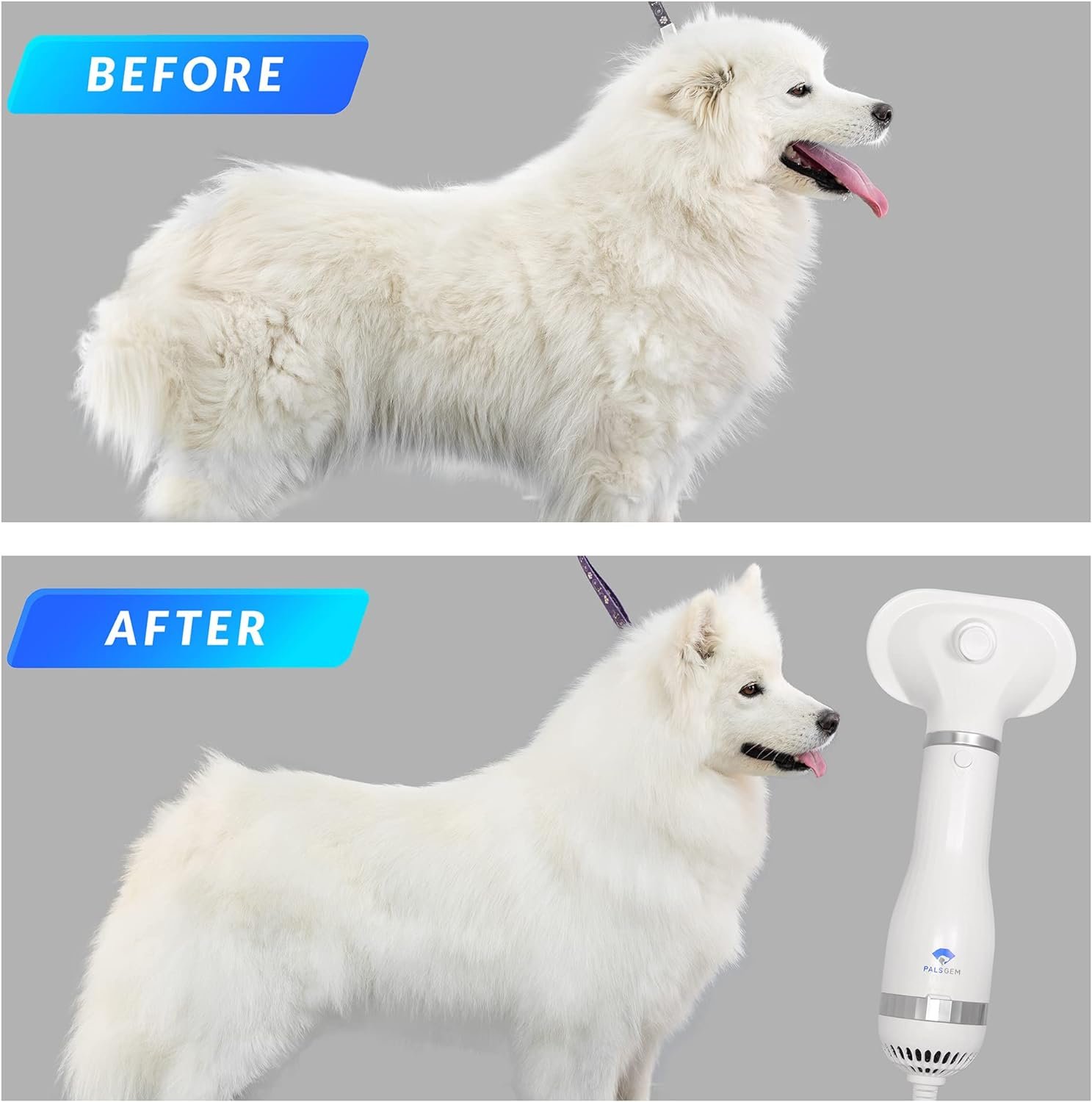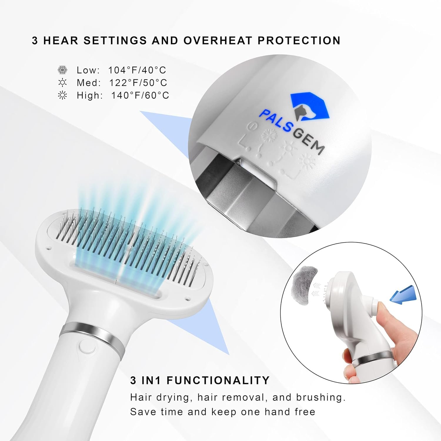 Newest Drying While Brushing and Grooming – Always struggled to dry and brush pet’s hair at the same time after a bath? Palsgem pet dryer is the 3 in 1 solution. You can easily remove matted hair and tangles from your pets while drying, thanks to the creative 3 in 1 design.
