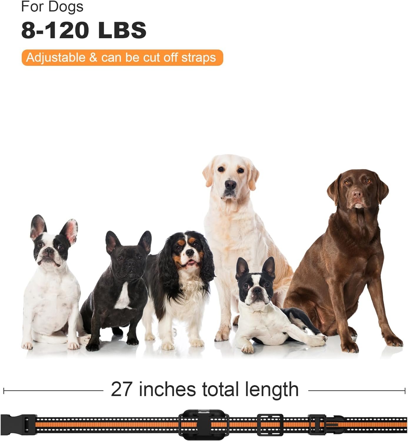 Waterproof Adjustable E Collar: Designed for comfort and durability, the electronic training collar is IP67-rated for water resistance and can be adjusted between 5 to 27 inches, making shock collar for dogs suitable for both small and large dogs weighing between 8 to 120 pounds.This adjustability ensures a comfortable fit for a broad spectrum of dog breeds.