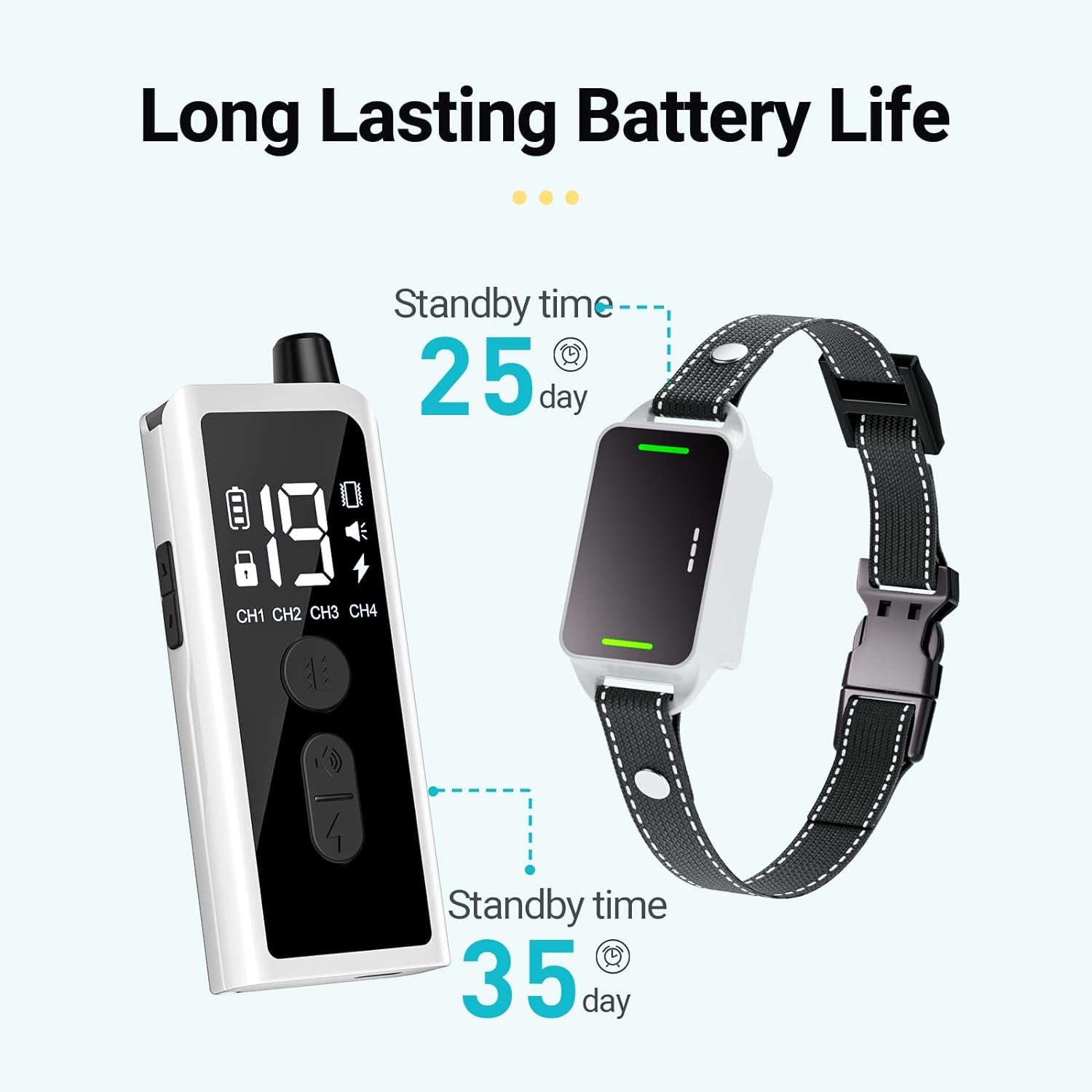 🐕This e-collar boasts up to 25 days of standby time, while the remote lasts for 35 days. The collar receiver is waterproof with an IP67 rating (note: the remote control is not waterproof), Making it suitable for use in any environmental conditions.