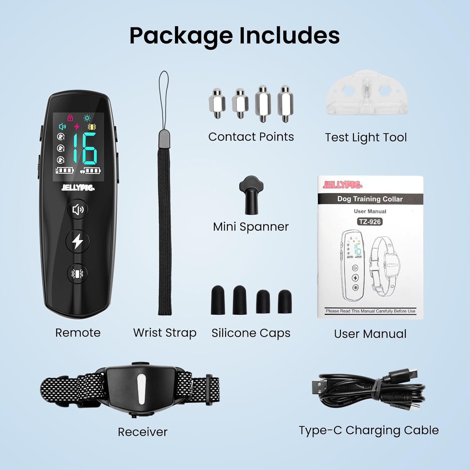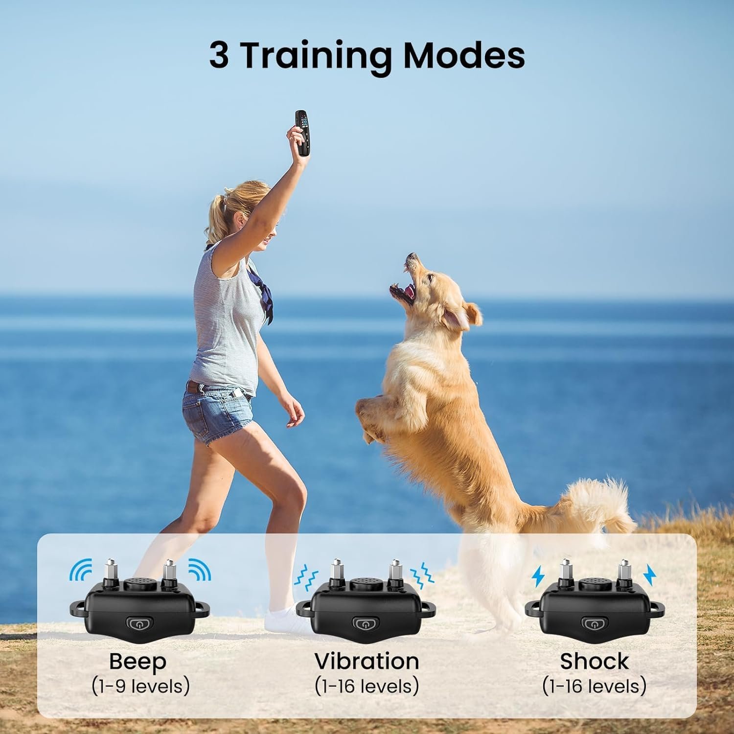 3 Effective and Humane Training Modes: Our dog training collar offers 3 humane training modes with adjustable beep(1-8 levels), vibration(1-16 levels), safe shock(1-16 levels). You can customize the modes to suit your dog’s temperament, making training easy and effective.
