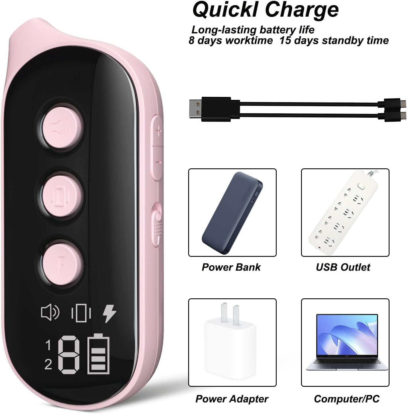 Quick Charge: After 2 hours of quick charging, the electric dog collar can be used for 8-11 days and standby time up to 180 days, the LED screen will show the remaining power, it can be easily charged by using a car charger or rechargeable battery, you don’t need to worry about running out of power when you are out and about.