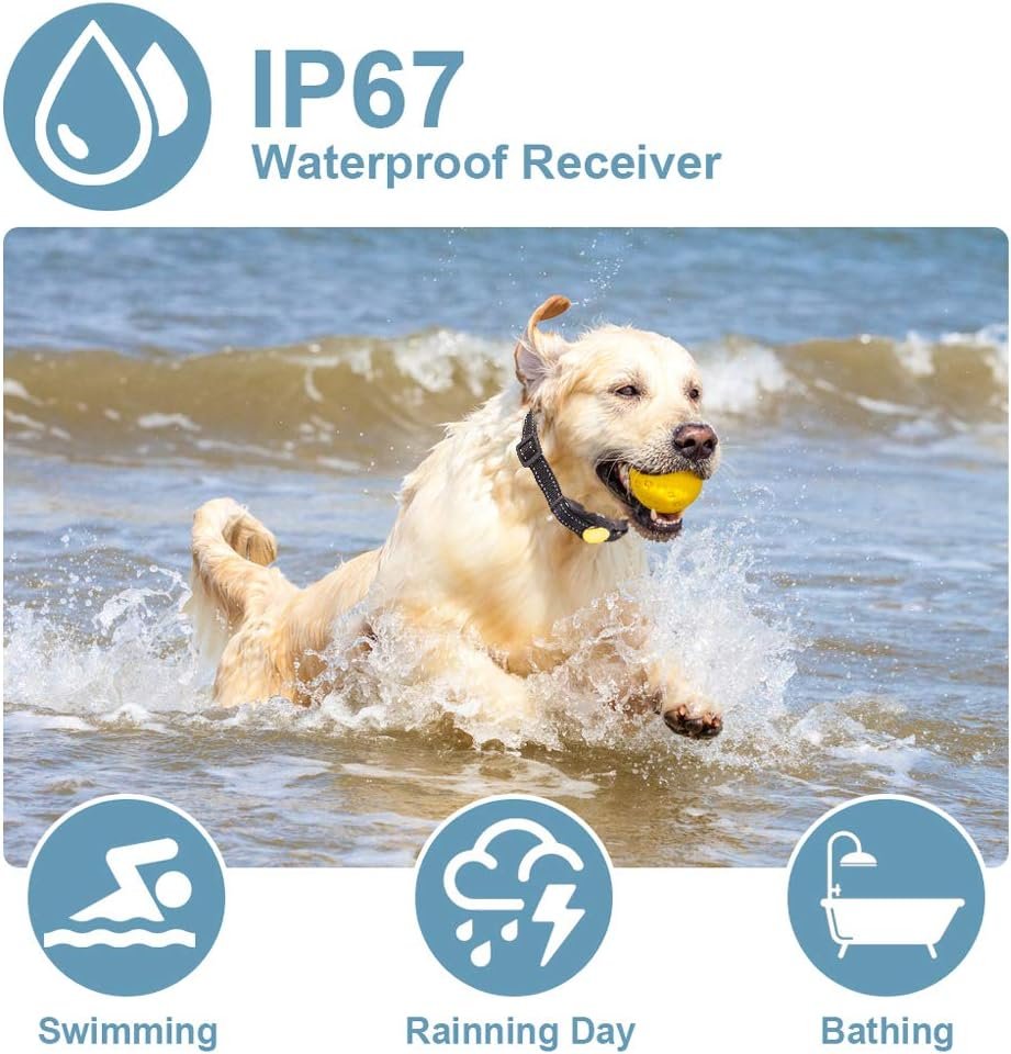 Rechargeable, Waterproof Durability — Rated IP67 waterproof, this collar receiver works doesn’t need to be taken off when your dog goes for a swim, chases toys around a pool, or plays in the rain. Each dog shock collar boasts Lithium-Polymer batteries that charge in 2-3 hours and last 15-20 days.