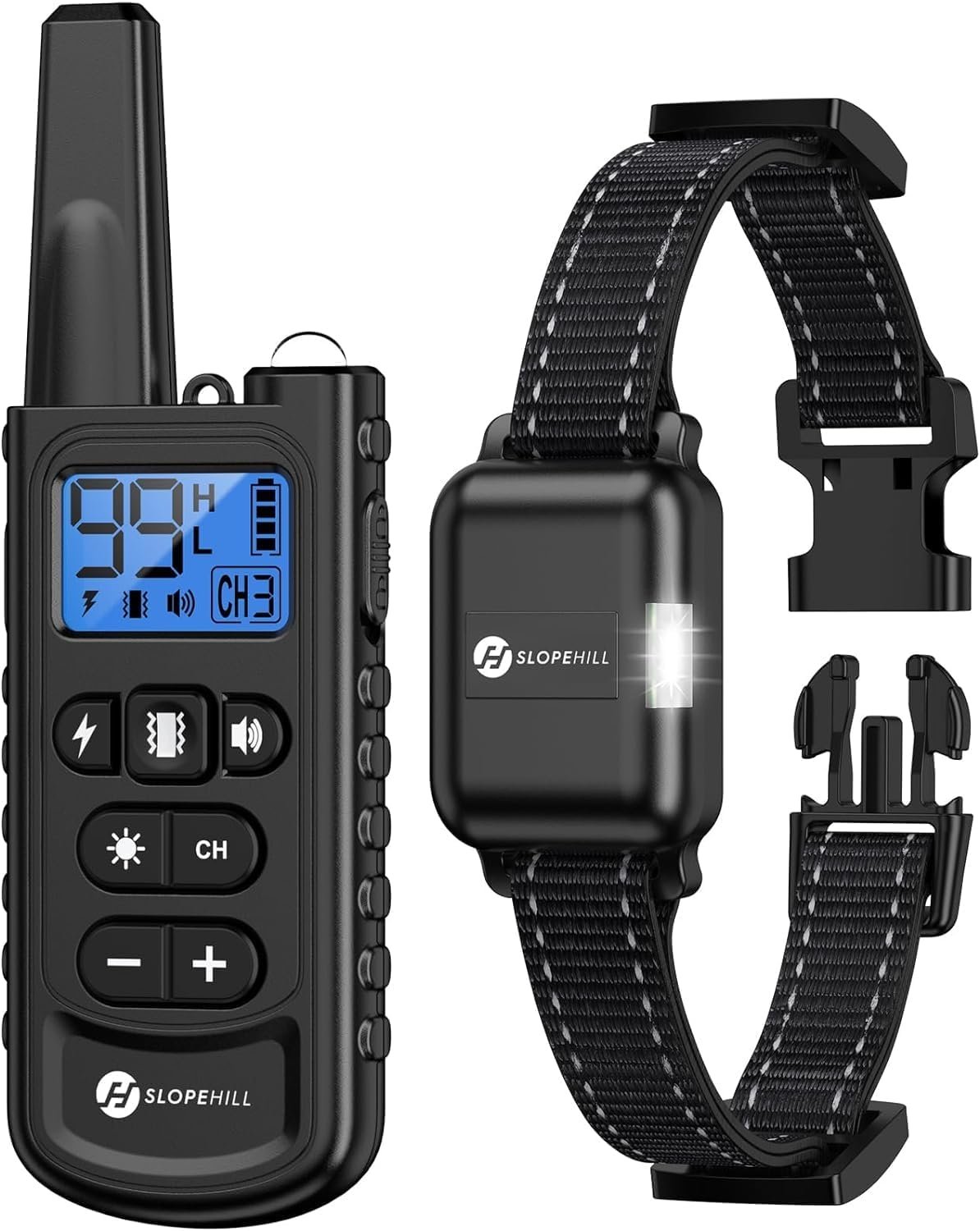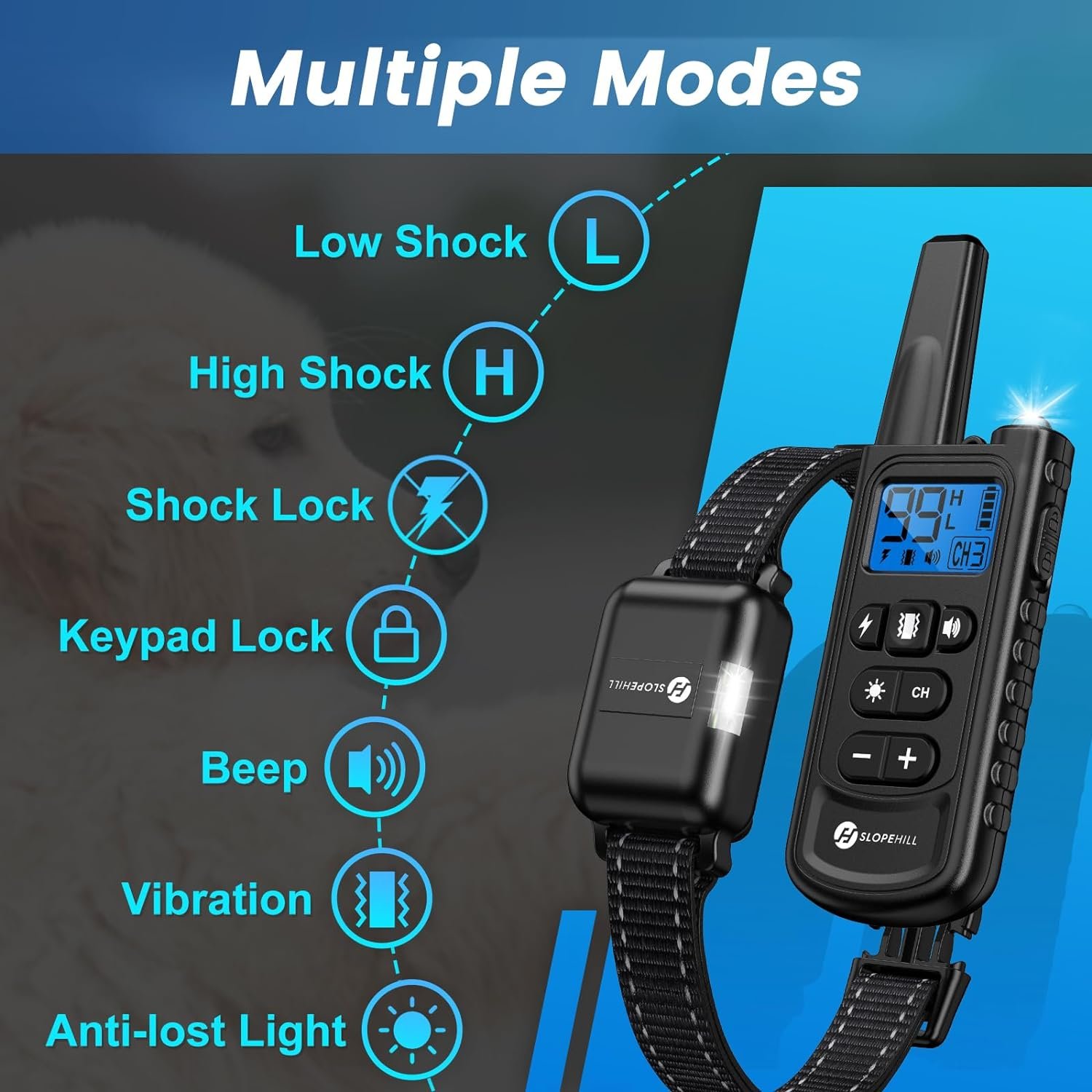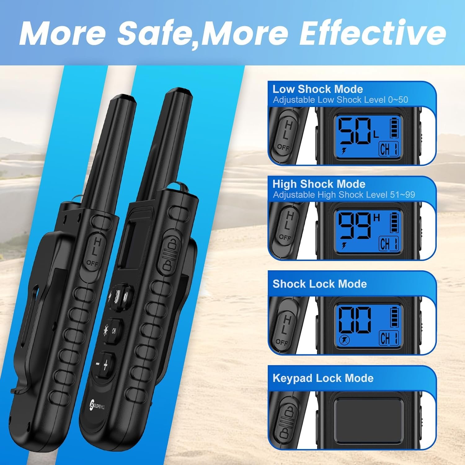 Shock locked mode is convenient for you to use only vibration and beep mode. Low shock(0~50), high shock(51~99), kepad lock modes help you adjust the accurate and comfortable static level for your dog and prevents any misoperation on the remote.