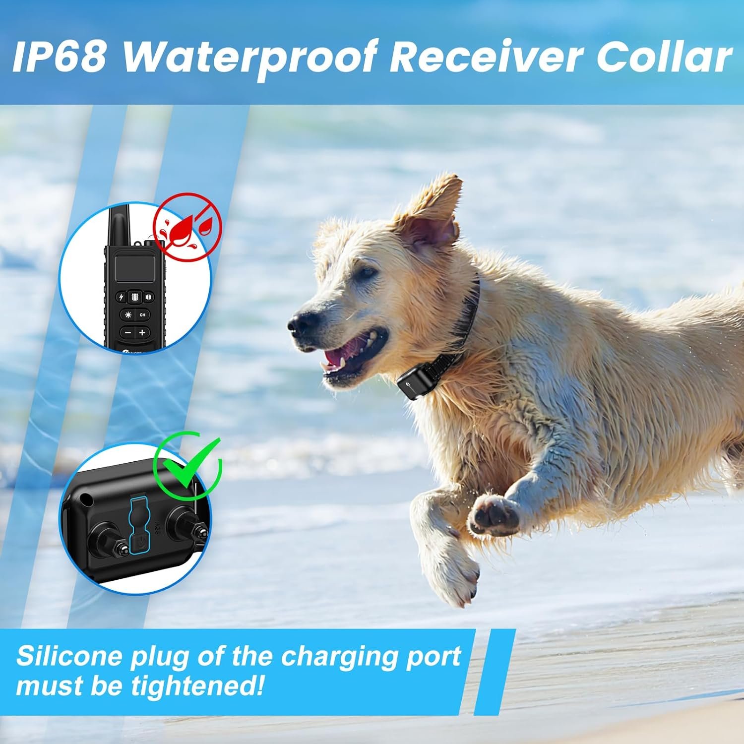 IP68 Waterproof and adjustable electronic trainer collar: The training collar receiver is waterproof which offers your pets maximum flexibility during outdoor activities. Size adjustable collar strap, length from 8 to 26inches, fits dogs from 5 to 140 lbs