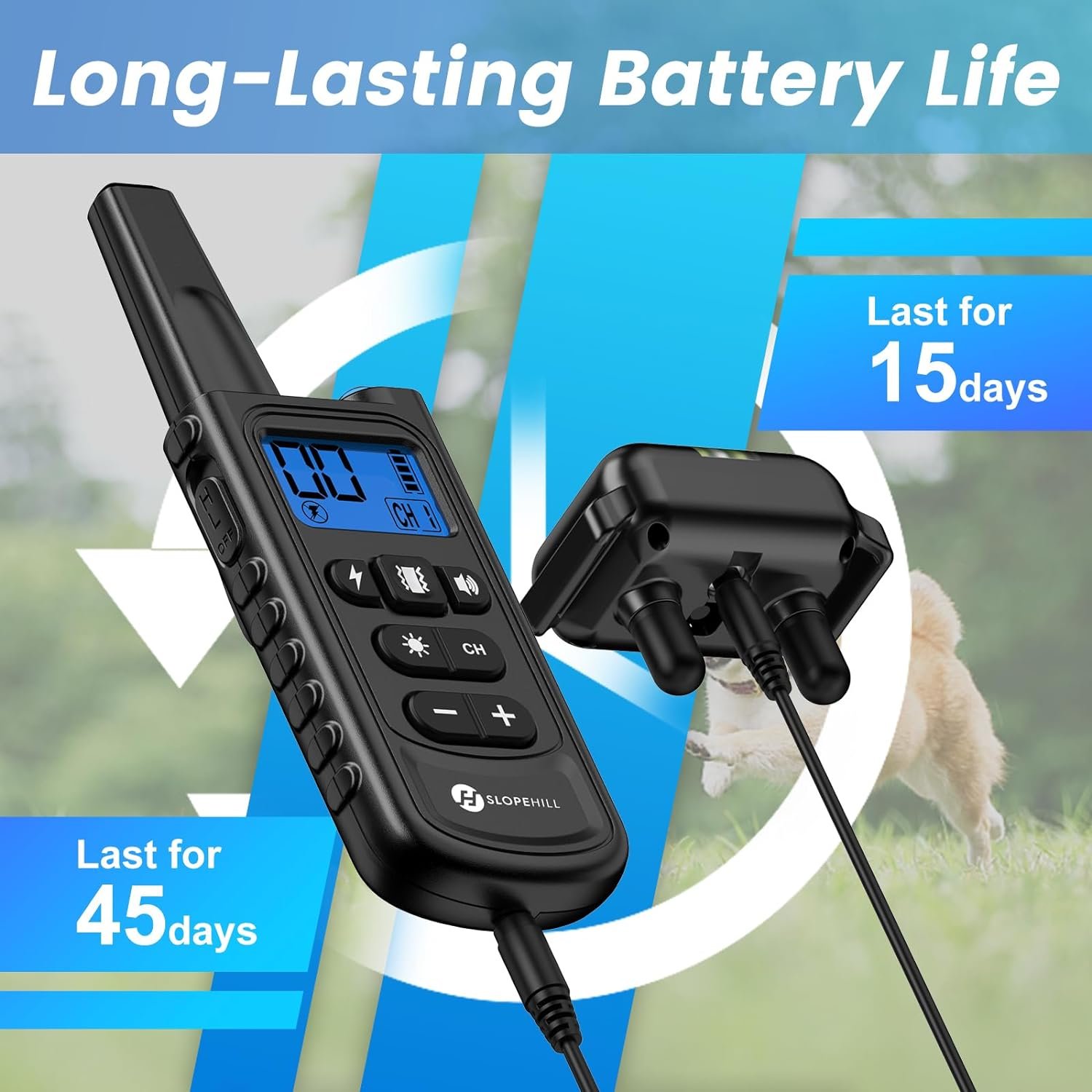 Extra-long life and rechargeable battery: rechargeable remote and receiver, a general USB charging cable included in the package can charge them at the same time. After 2 hours of fully charging, the collar is able to work 15-20 days
