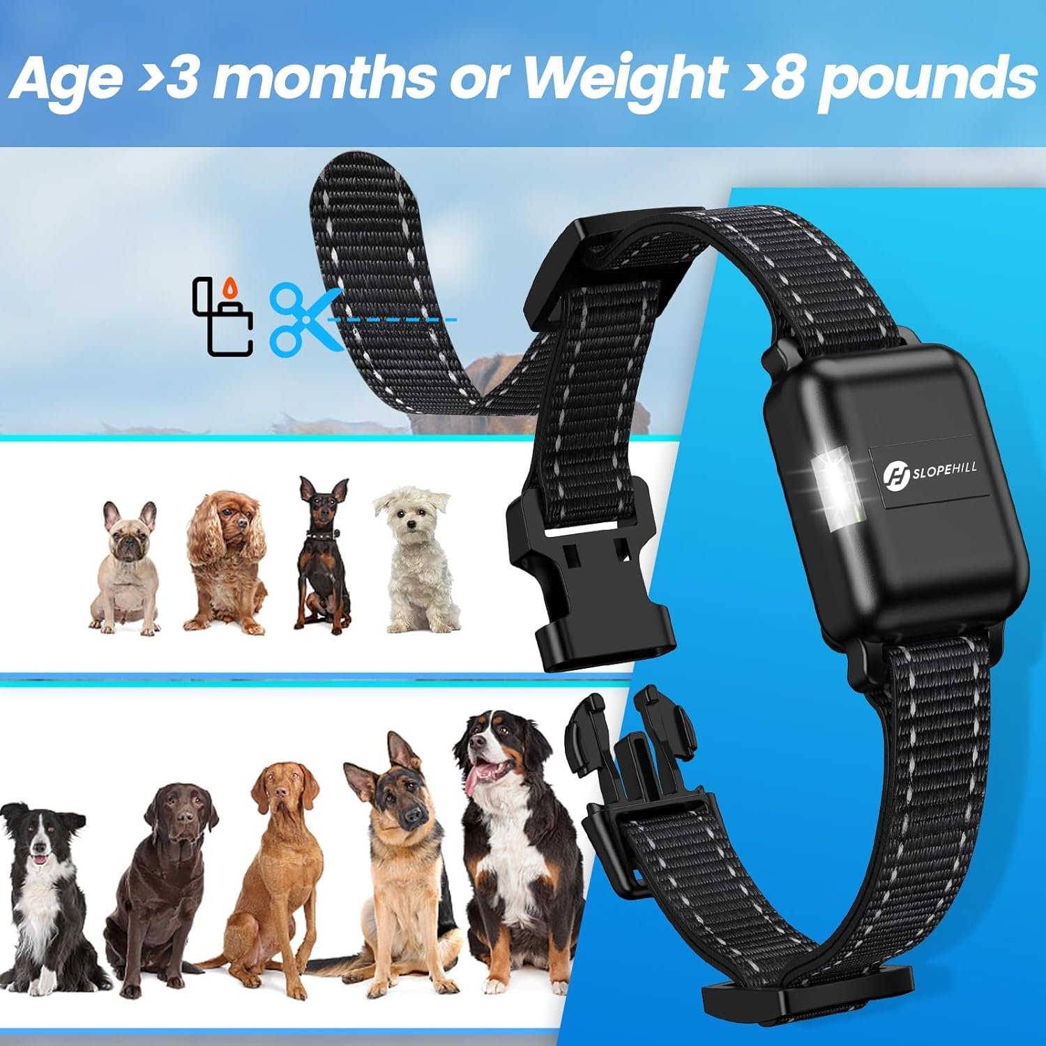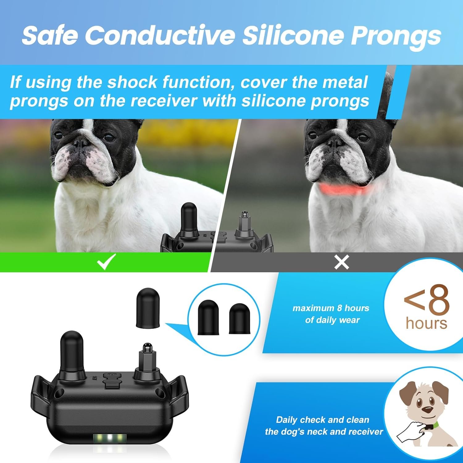 If the dog’s hair is too long or thick, it is necessary to slightly shave off the hair on the neck collar contact point to help with product use.