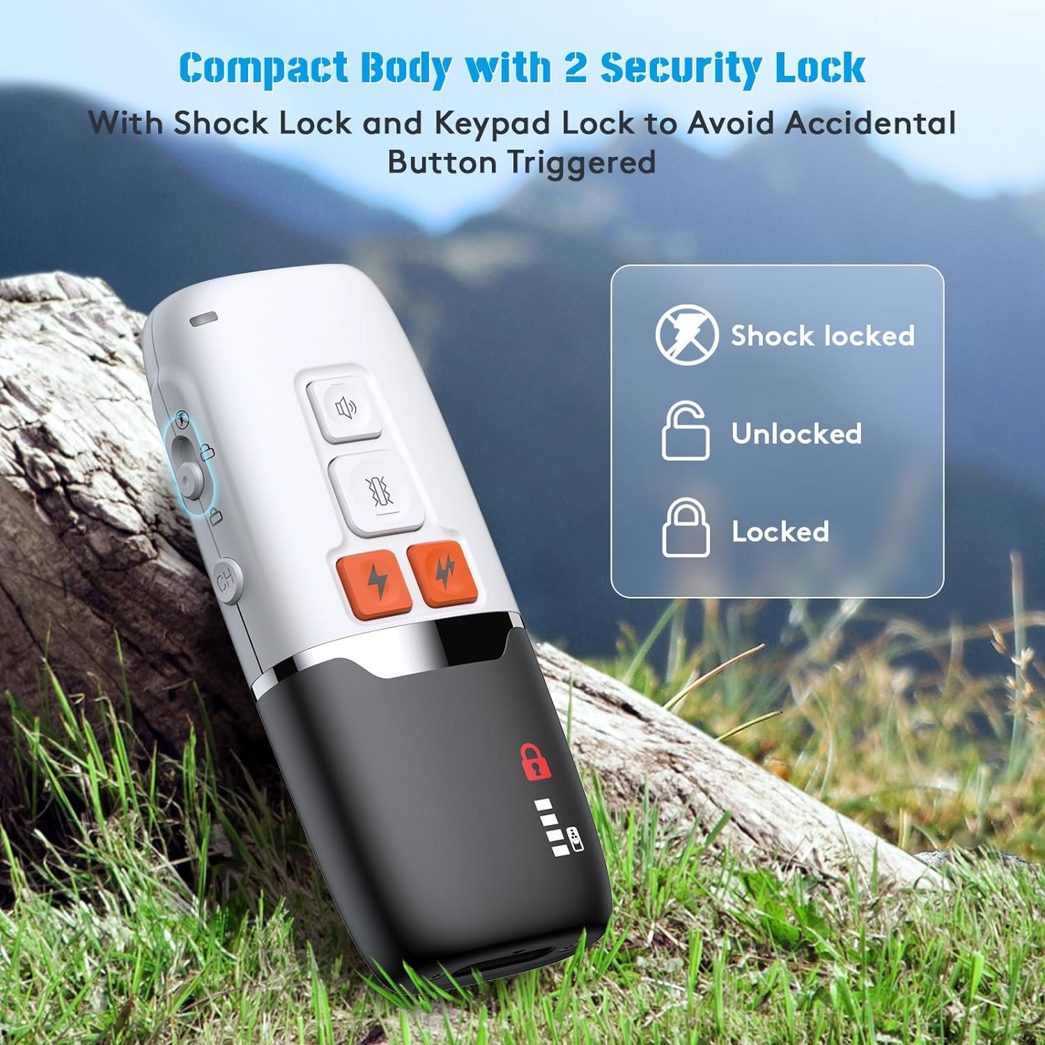 【3+1 Safe Training Modes with Shock Security Lock】The dog shocker for large medium small dog has 4 modes: Beep(0-8), Vibration(0-99), Shock(1-99), and 20% Shock Boost, helping you to find the most effective way.Besides, our dog training collar with shock security lock, to avoid accidental operation when shock mode is not needed.