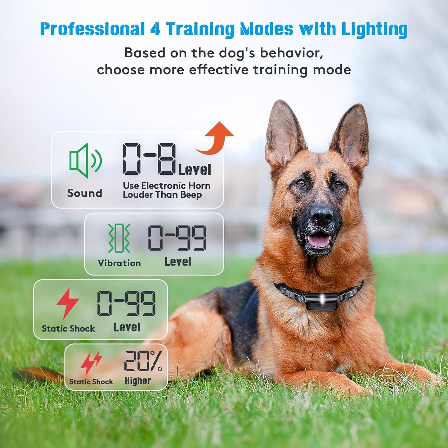 【Upgraded Loudly Electronic Horn Progressive Beep(1-8)】We hope to provide a safer training mode for our dogs as much as possible to avoid harm to them,so our beep mode adopts the newest electronic horn rather than normal buzzer,that means it can provide louder voice.Besides,it has 8 different gradually increases tone,that means you can selectively use different sounds to train your dog to complete different actions or response.