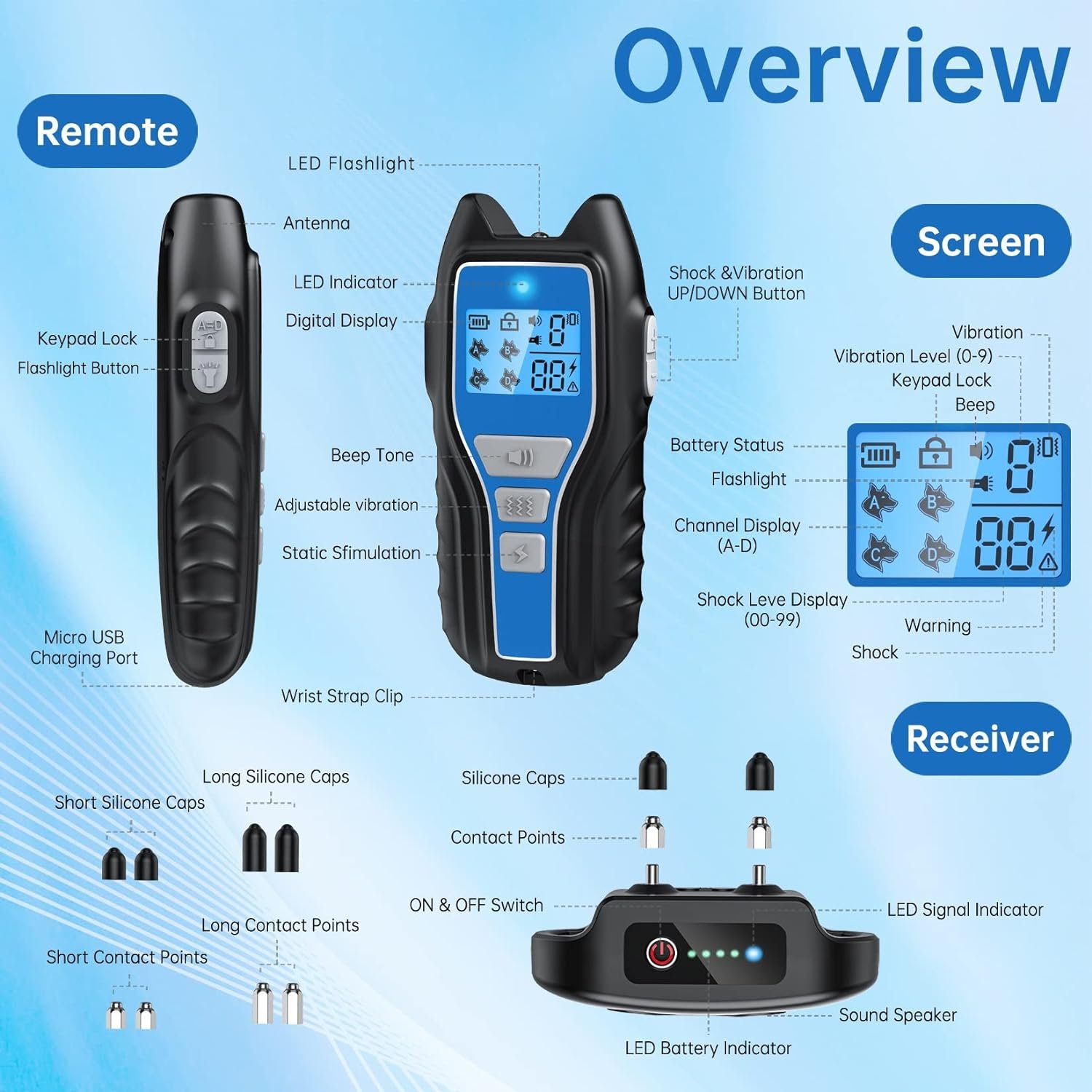 【1+4 Channels Maximum Control & Longer Remote Control Range】The remote has four channels and supports the training of four dogs at the same time. Up to 1600Ft range allows you to train your dogs easily indoors/outdoors.