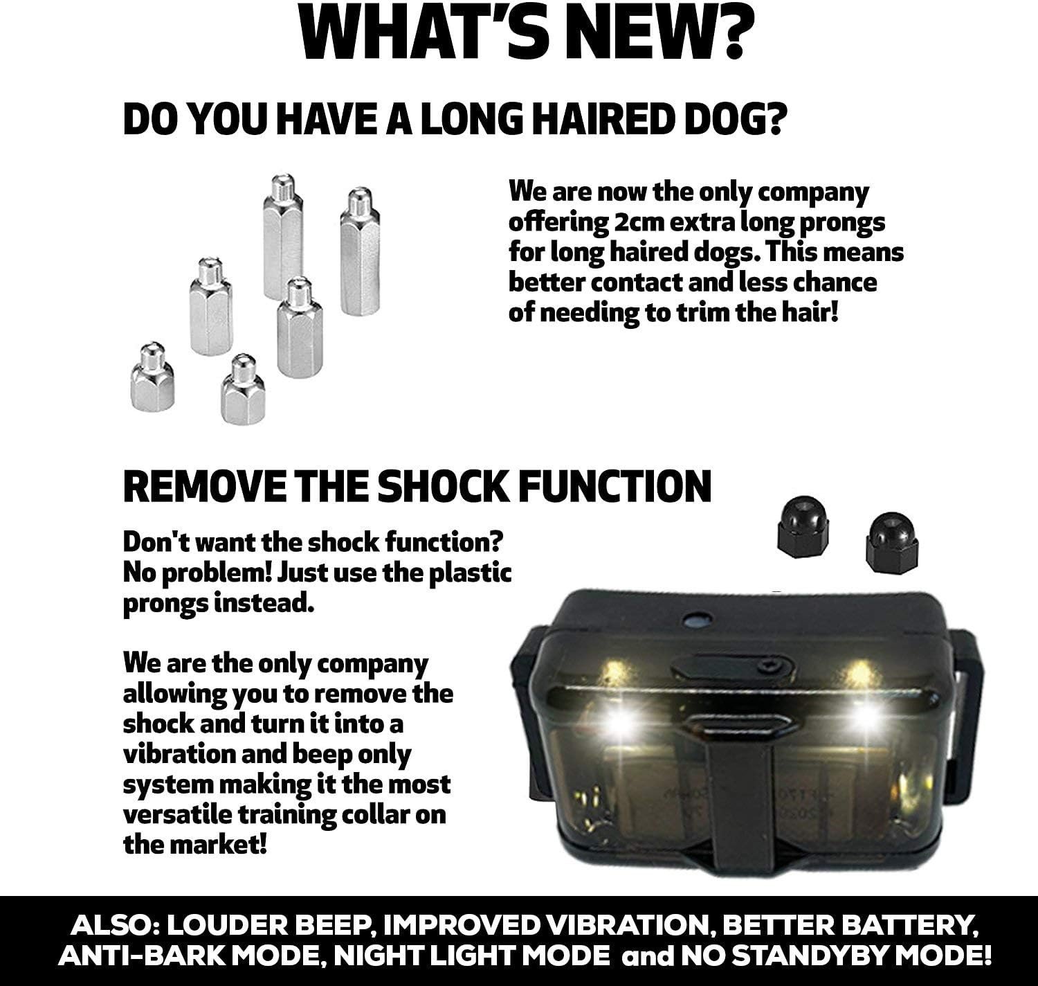 VARIABLE SHOCK & VIBRATION LEVELS, ANTI BARK & LIGHT for NIGHT MODE; train up to 3 dogs at once (additional collars required) with up to 10 levels of continuous or momentary shock (hold down button to shock for 1 up to 8 seconds, ideal for emergencies!) vibrations, or beeps, for safe, efficient training, allowing you to teach your dog a range of commands. Sometimes it only takes one click of a button to completely change the behavior of your dog and the vibration button does the job for most!