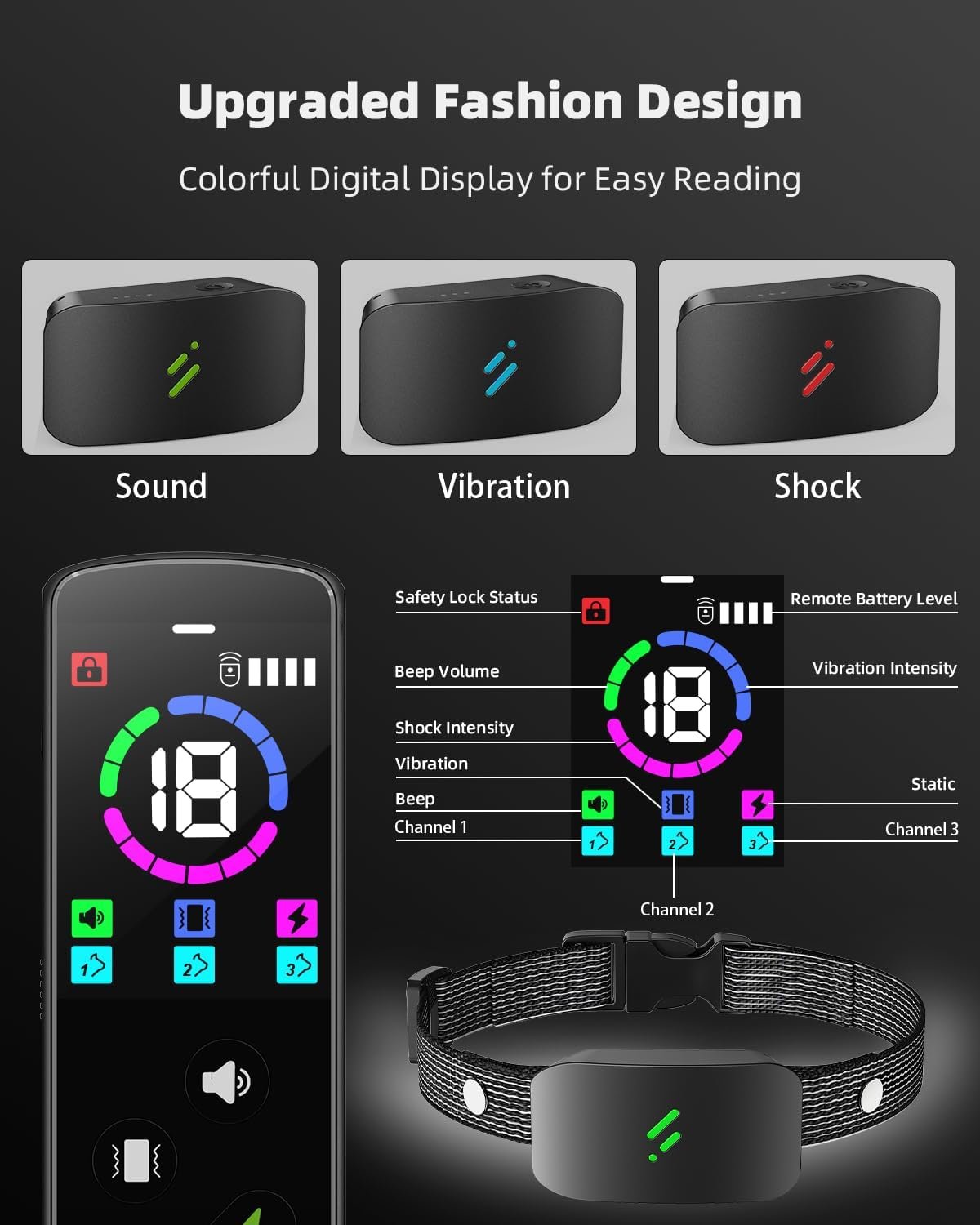 【Enhanced Static Shock Control】For those who prefer electric shocks, we’ve got you covered. The shock collar now features 18 shock levels, and we’ve added a 30% intensity boost option for emergency situations. The package includes 2 sets of silicone prongs, ensuring a perfect fit for dogs of different sizes and coat types while protecting their skin. The safety keypad lock prevents accidental button presses