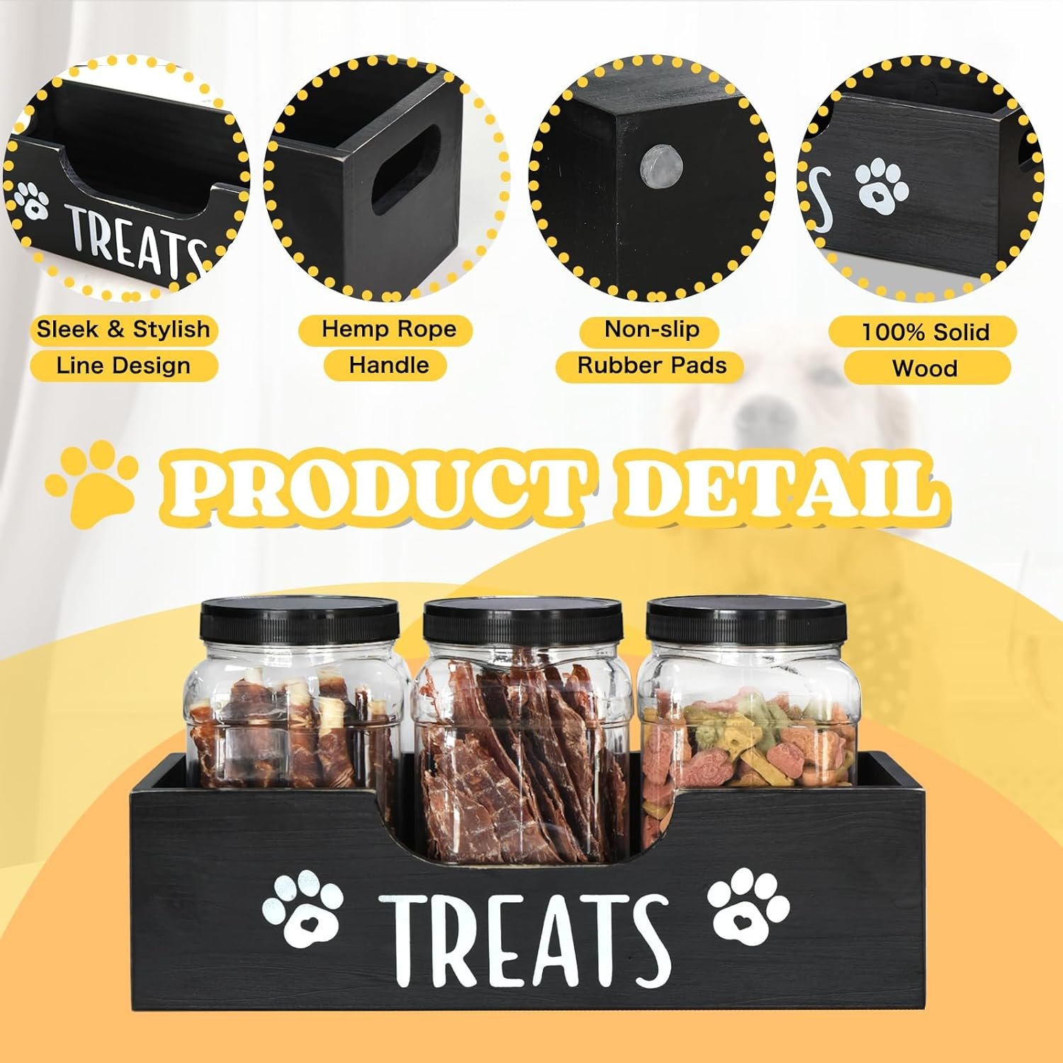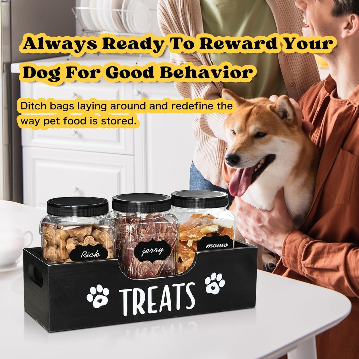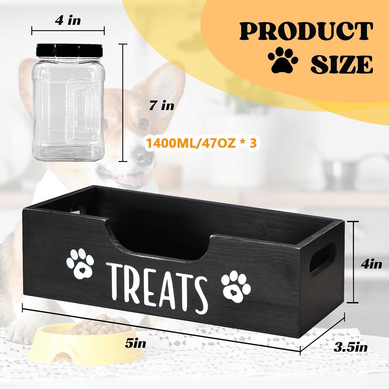 Dog Treat Container, Wood Dog Food Storage Container Holder with 3 Plastic Dog Treat Jars, Farmhouse Dog Food Storage Cat Treat Container, Pet Food Storage Container for Dog, Cat, Small Animal