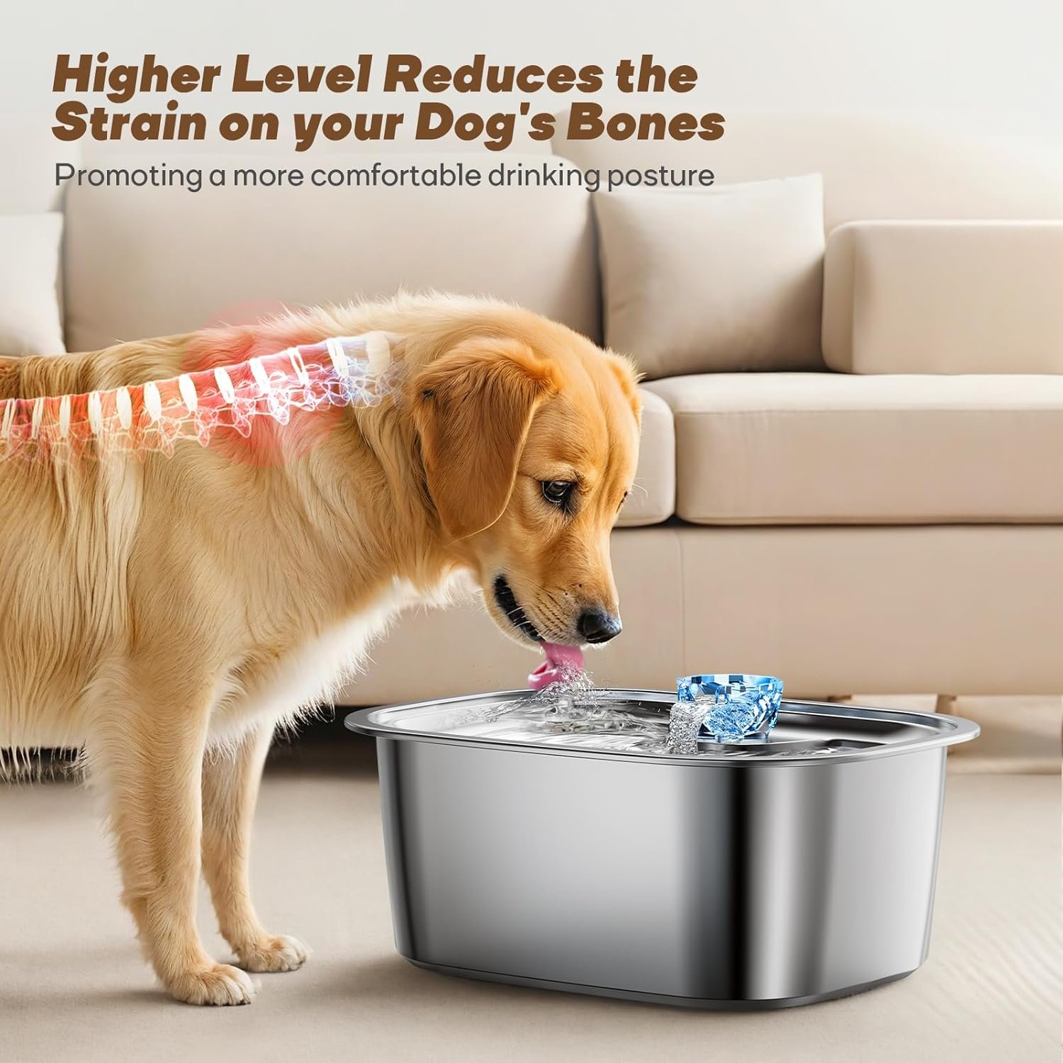 Humanized and Pet-friendly Design: With a wide handle design for easy mobility, the height of the dog fountain is 15cm, reduced the extent to which dogs lower their heads while drinking water, alleviating pressure on their spines. The depth of the water tray is 4cm, the raised rim design reduces spills and splashes, keeping your home clean.