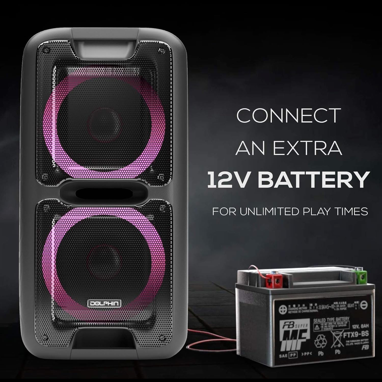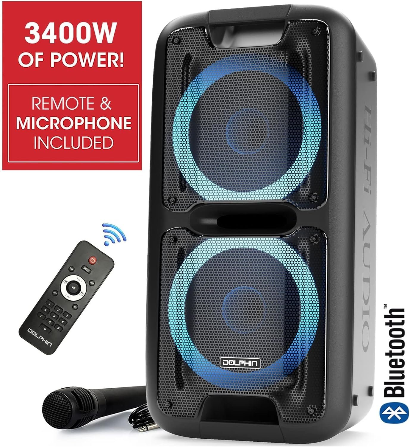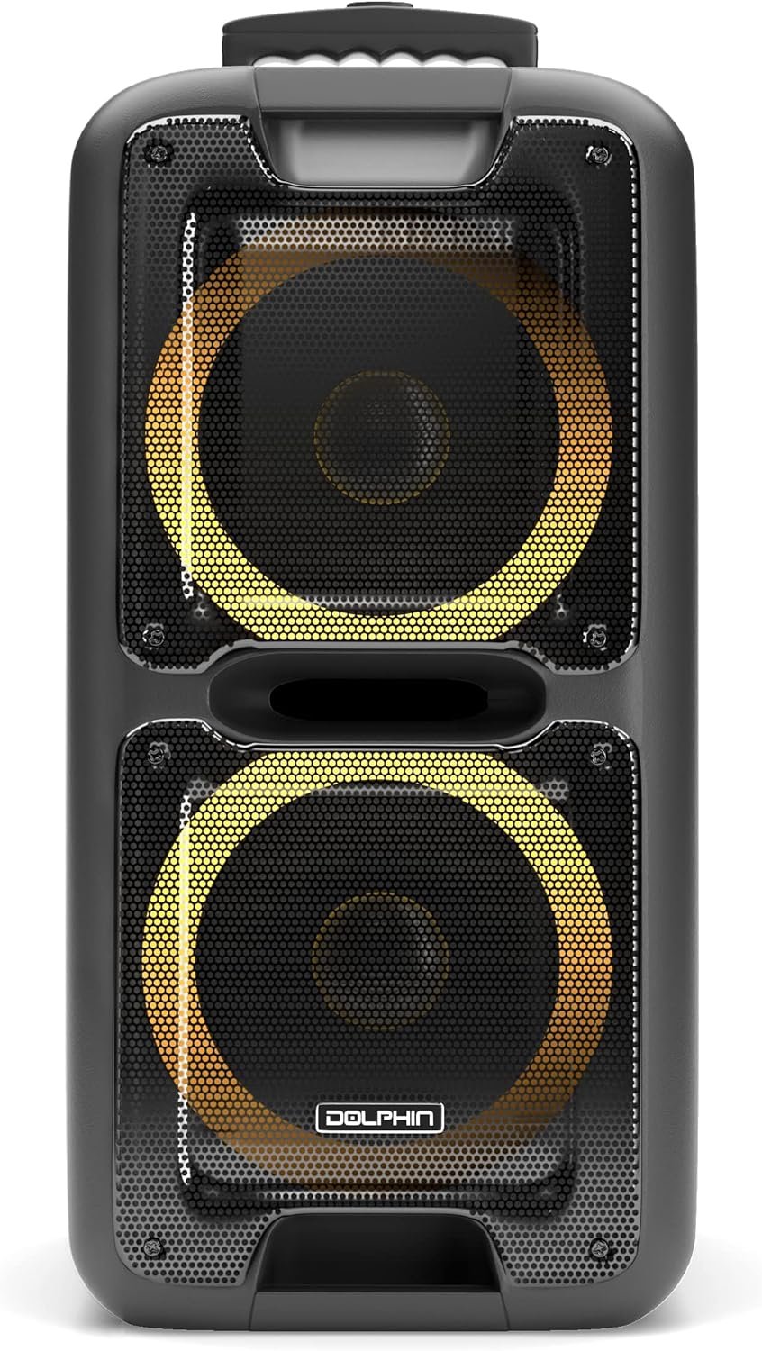 Dolphin SP-2100RBT Portable Bluetooth Speaker System – Party Speaker on Wheels with Sound-Activated Light Show, Seamless Audio Sync, Powerful Bass, Dual 10″ Woofers, Long Battery Life