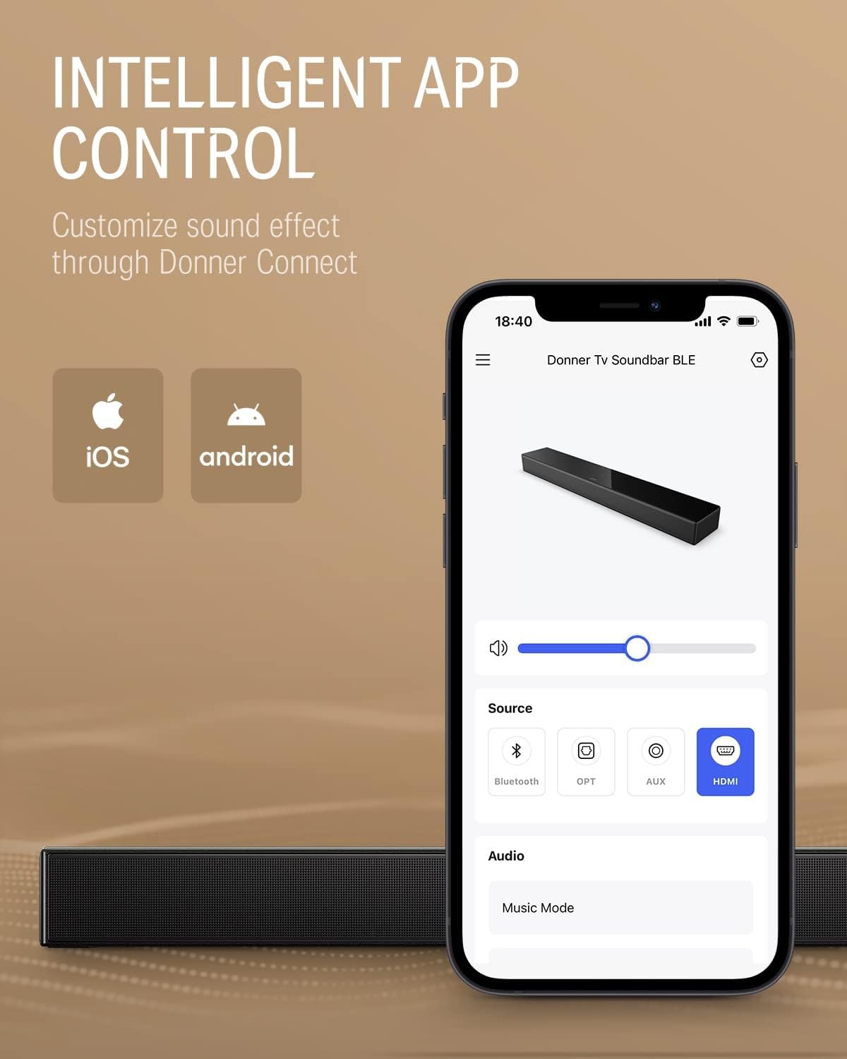📱EQUALIZER EDITOR – Donner DHT-S300 support customize sound effect through Donner Connect. This app is available for both Android and IOS, you can easily match the sound bar with your mobile via Bluetooth. Android users can try the NFC function to connect the soundbar and set up their own music mode. (NOTE: The NFC function is NOT available on IOS.) We have set up 3 kinds of preset modes: Music/Movie/Game. You can switch different modes to fit different usage scenarios.