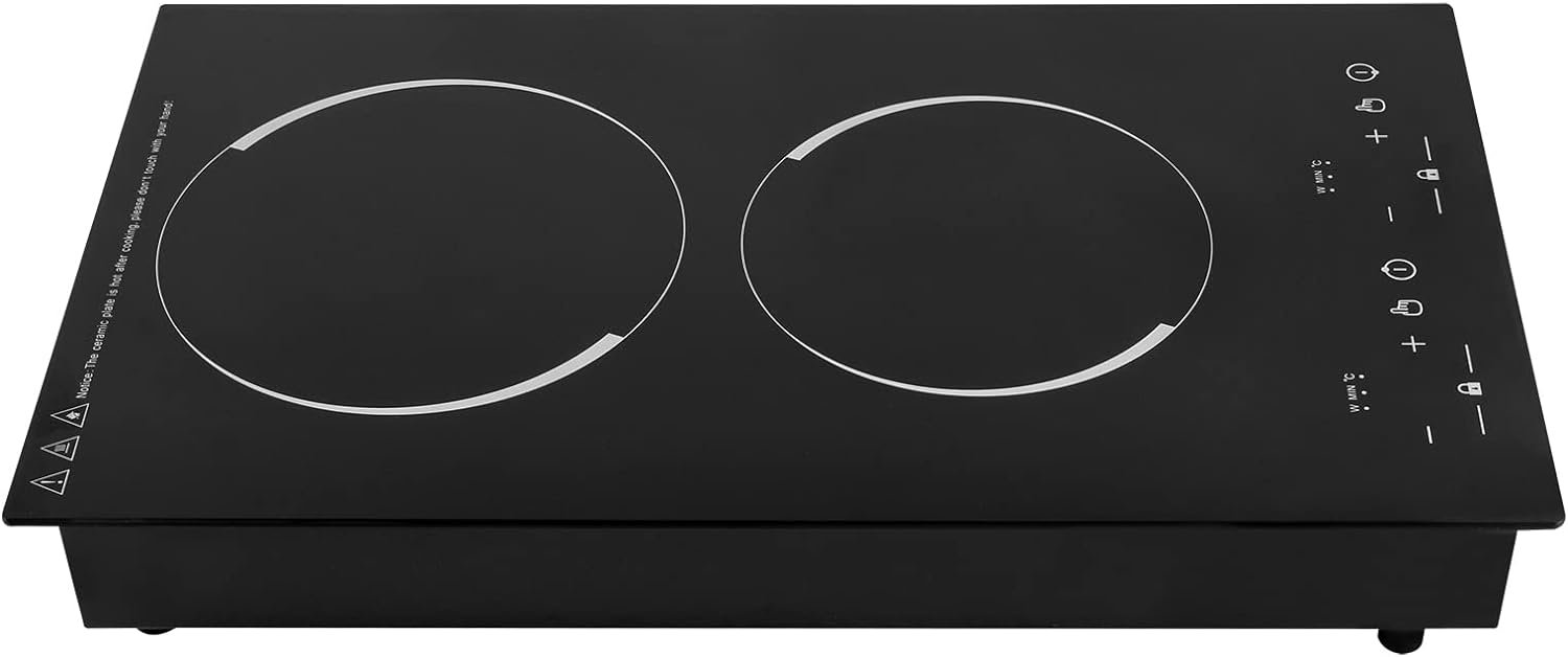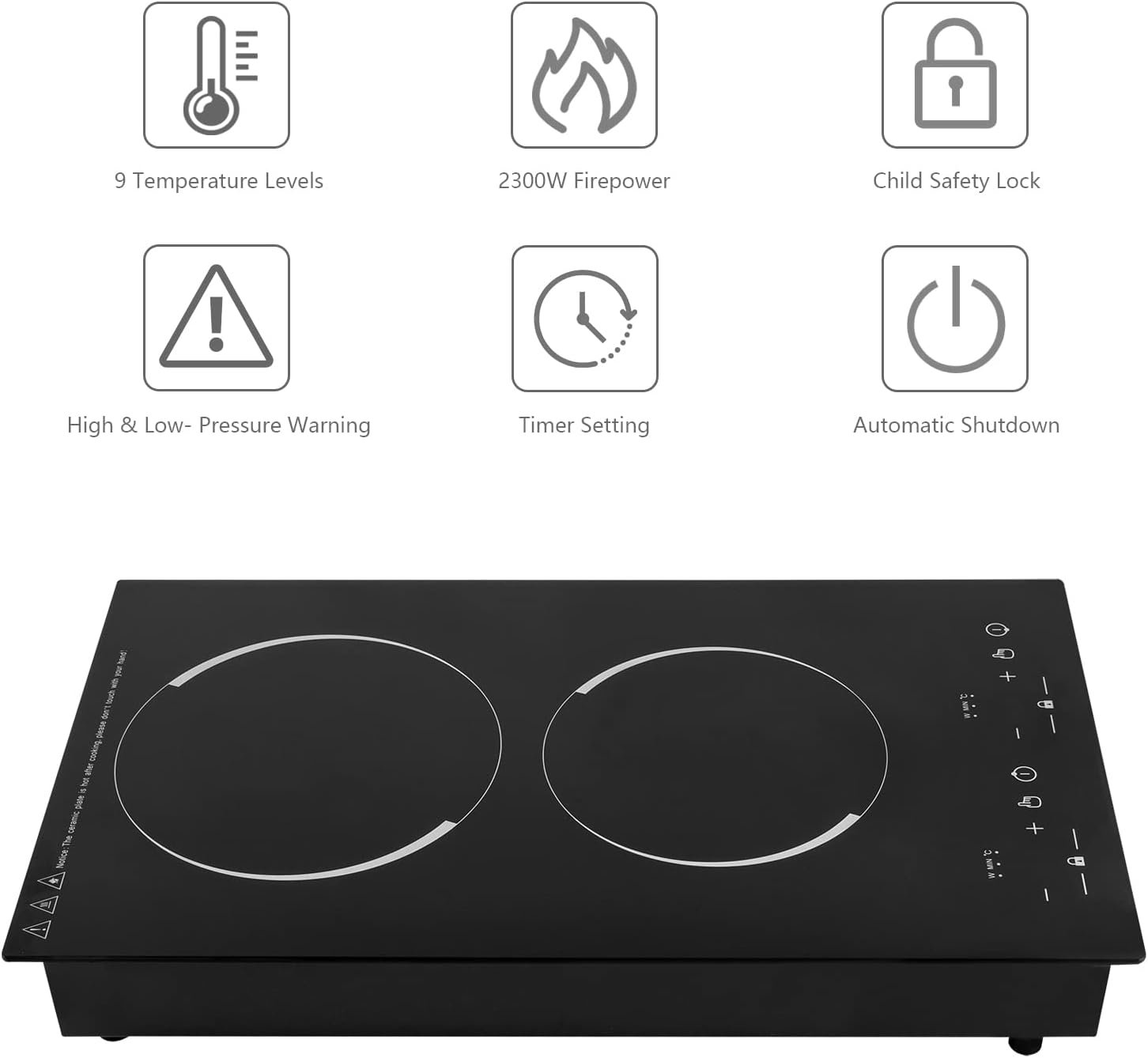 【Sturdy and Durable】The iron bottom shell of this double burner electric cooktop has been pieced and painted in one piece, which has good anti-corrosion and rust resistance. The 5-6 mm thick black crystal panel is high temperature resistant, scratch resistant, waterproof and has a long service life.