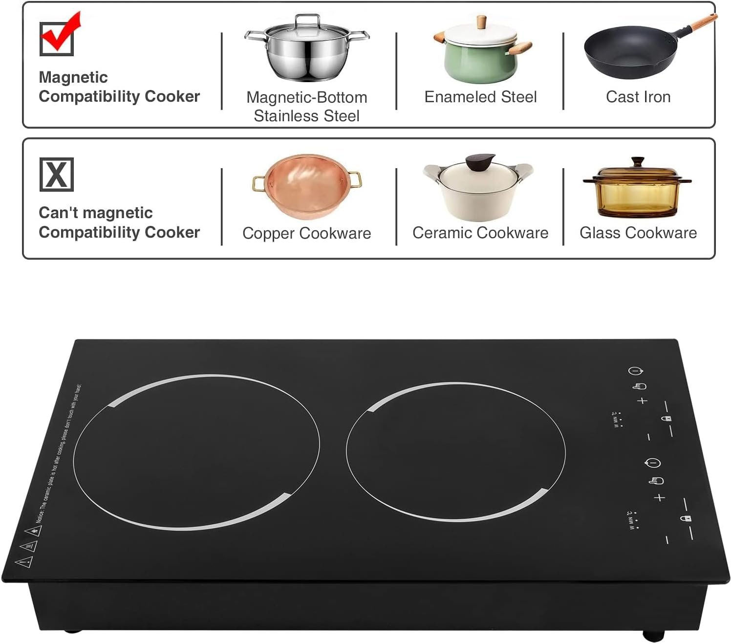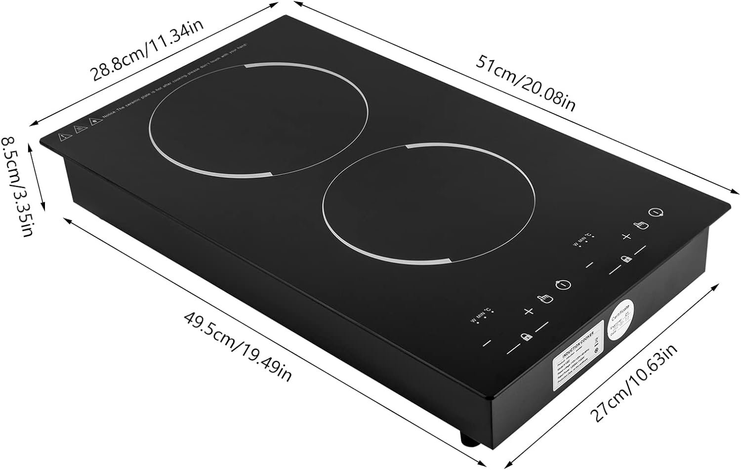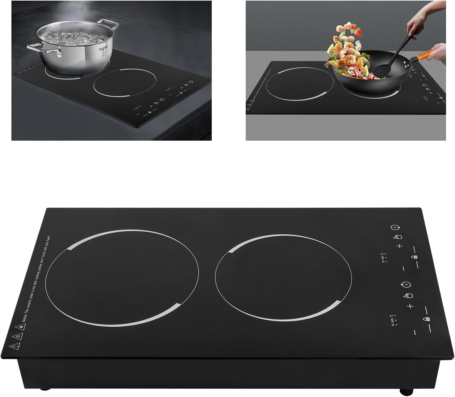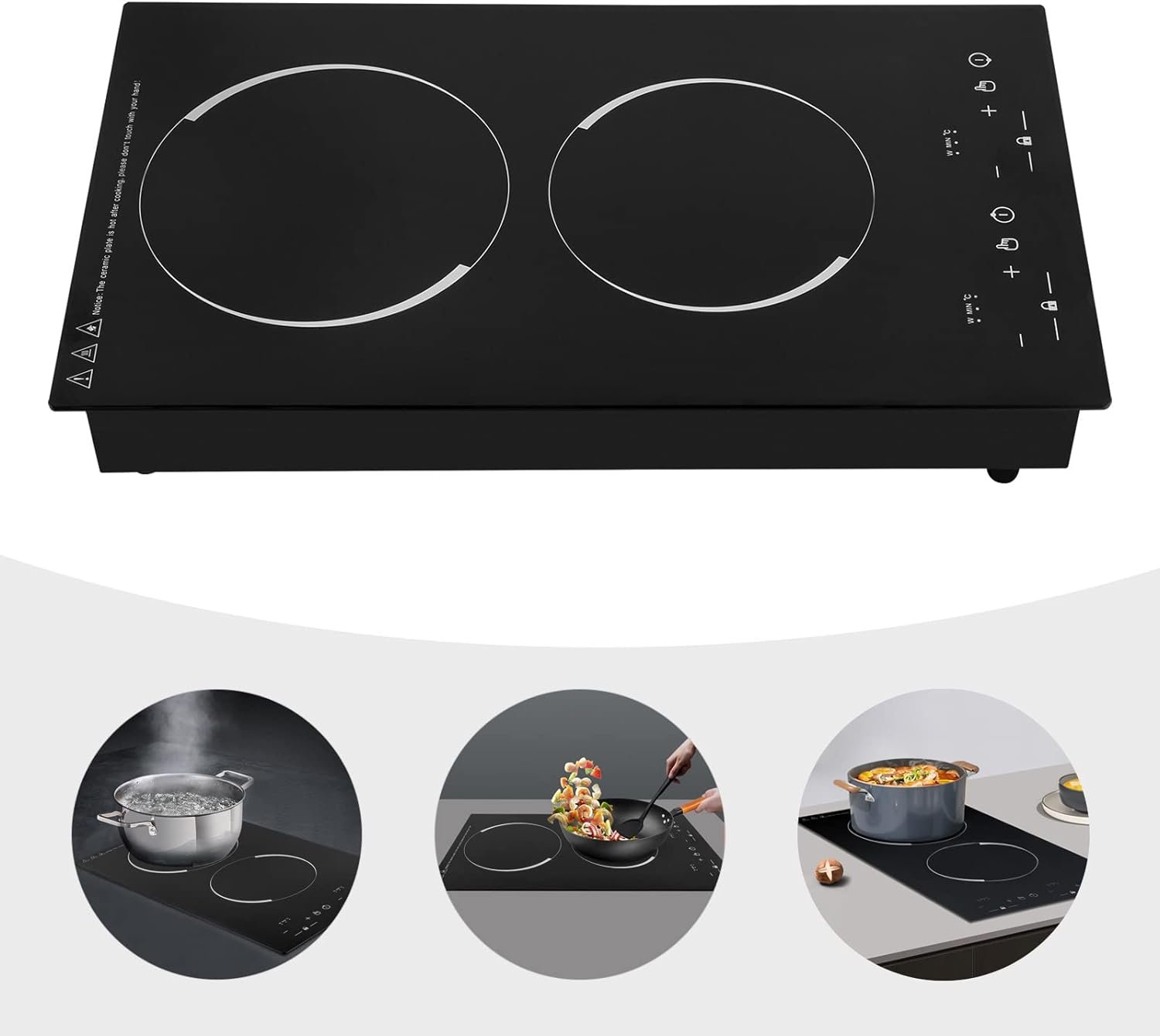 【Fast Heating】This 110 volt kitchen stove has upper and lower burners with 1200W and 1100W power respectively, adopting induction technology, aluminum heating plate coils are evenly distributed, fast energy transfer, power saving, fast boiling speed, improve cooking efficiency.