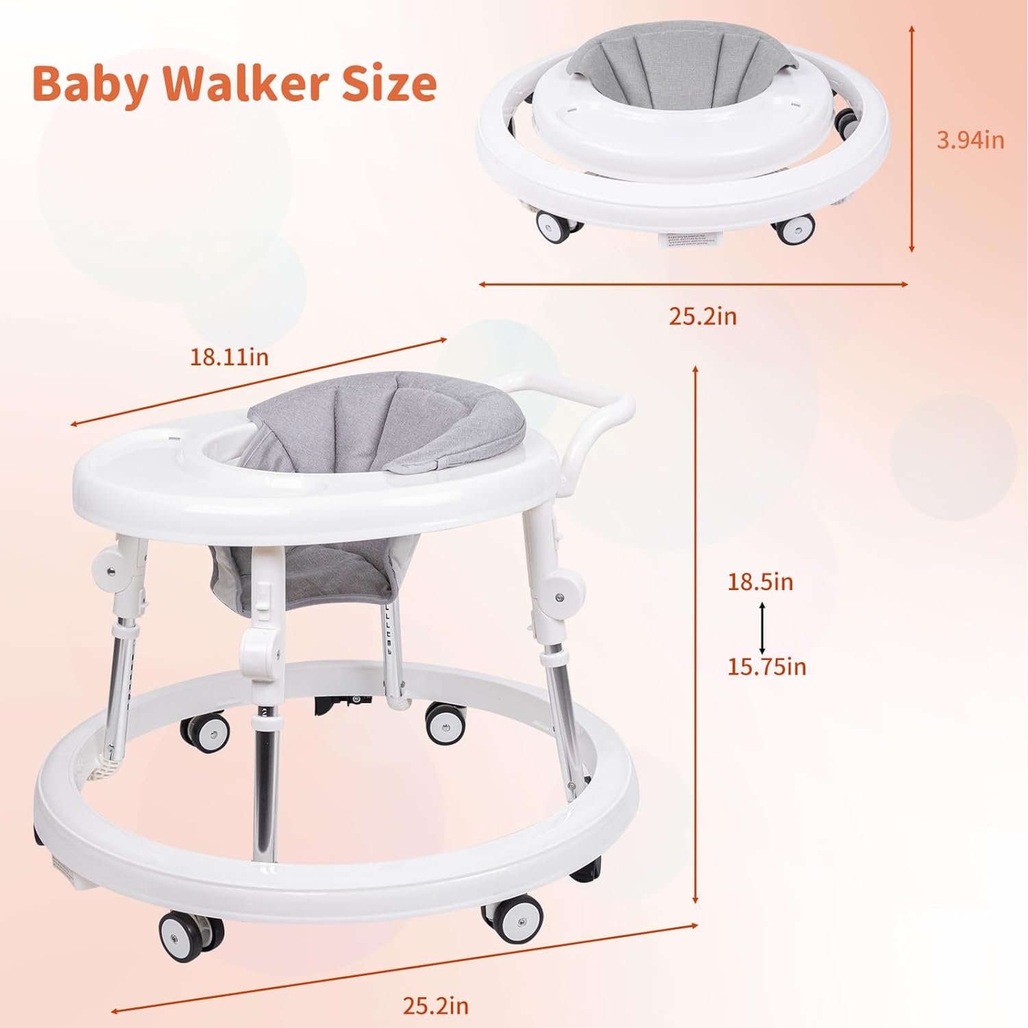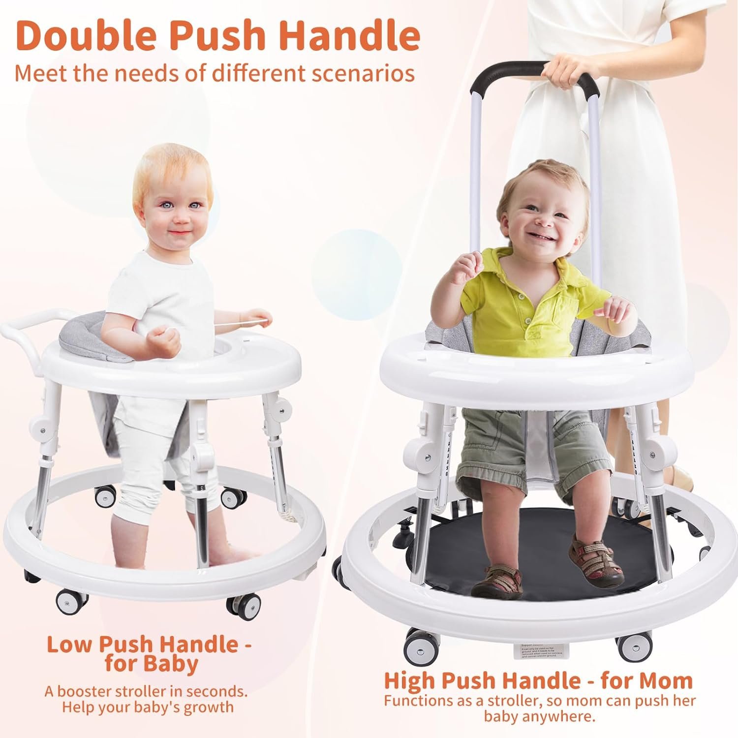 🔔【Double Push Handle】The baby walker contains 2 push handles, high push handle and low push handle, the low push handle is used for baby toddler boosting mode, the high push handle is convenient for mom to push baby forward.
