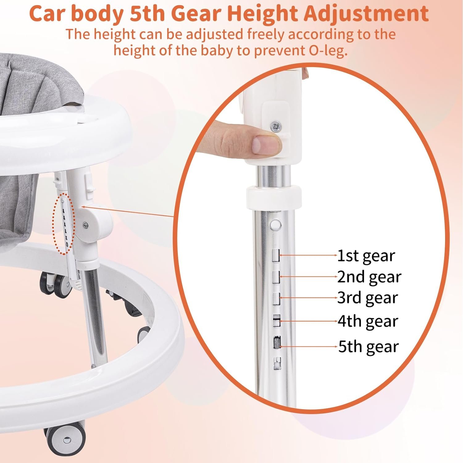 🔔【9-Gear Height Adjustment】The toddler walkers use 5-gear body height adjustment+4-gear seat pocket height adjustment, which can meet the needs of children of different ages and heights, and effectively prevent O-ring.
