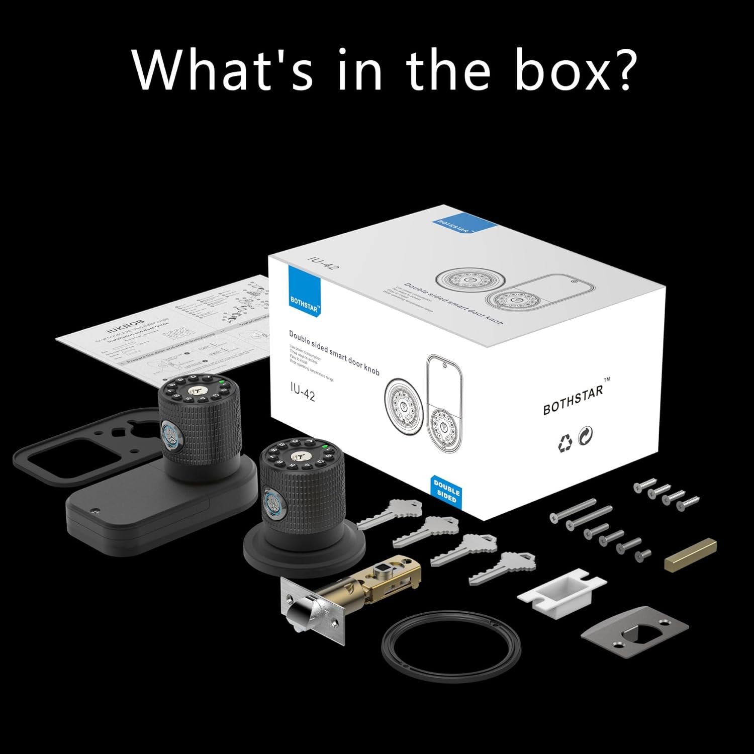 Two-Way Security for In and Out: This Double Sided Keypad Fingerprint Door Knob with Dual Cylinders offers the highest level of security to homes and businesses. 4-IN-1 Unlock ways. 100 fingerprints ,50 user codes, back-up keys,remote sharing codes. Ideal for exterior, front ,back, side doors,bedroom or garage,garden,fence entries. For any door requiring secure access control when in and out, such as offices, hotels, Airbnb, retail stores, medical facilities, government buildings.