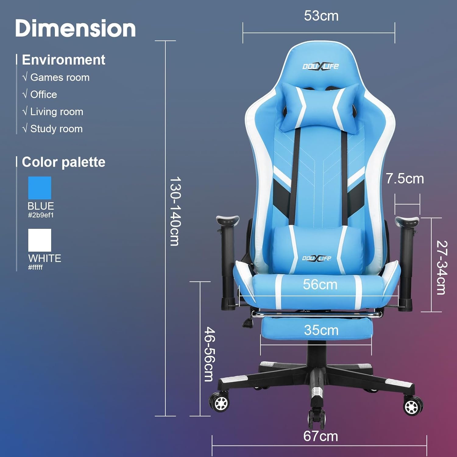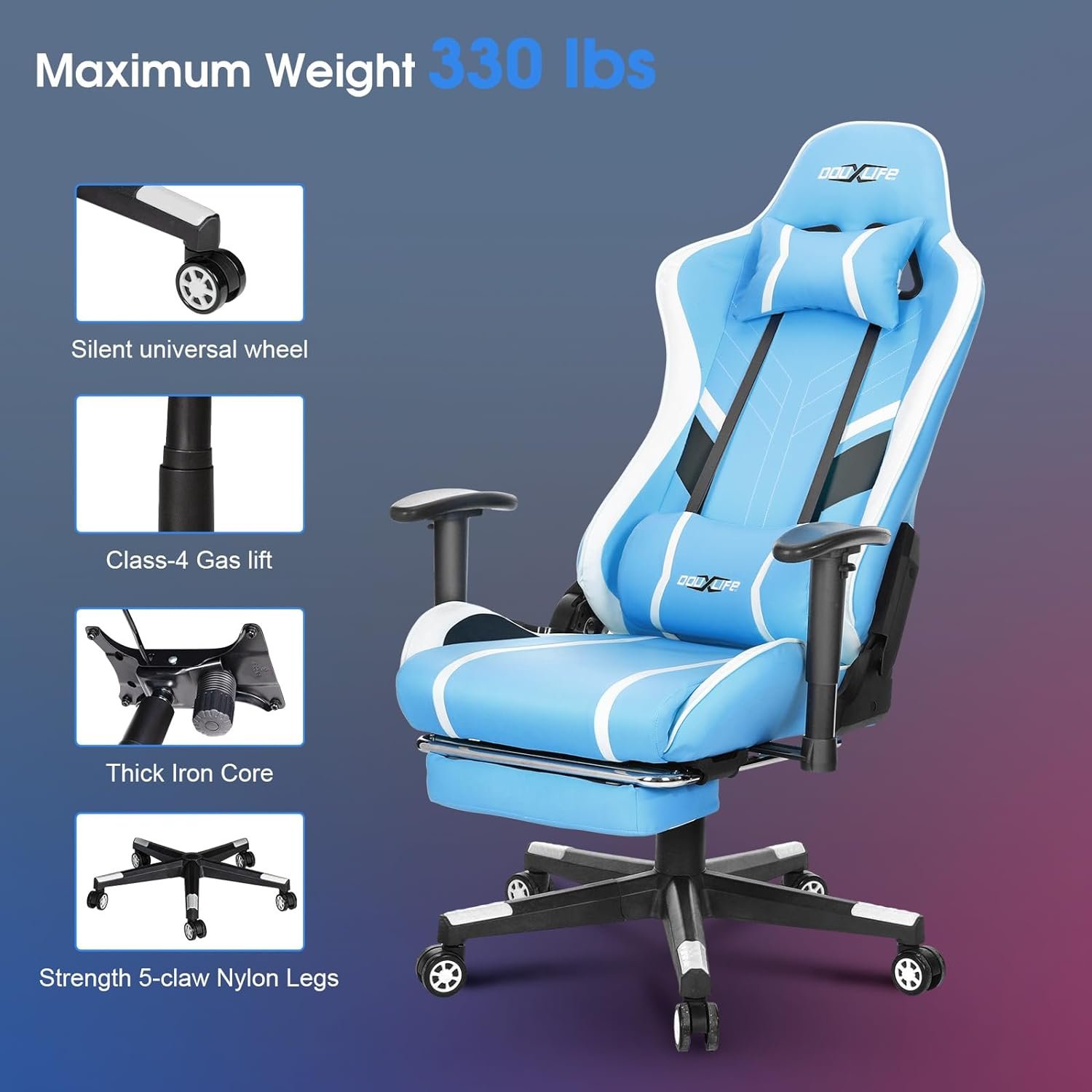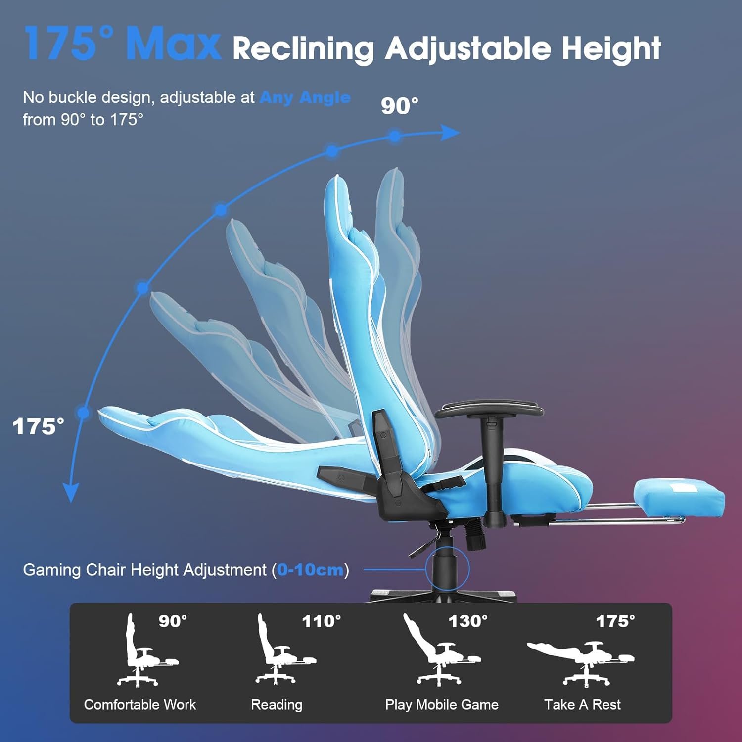 Douxlife Massage Gaming Chair 7-Point, Office Chair with Footrest and Lumbar Support, Adjustable Seat Height Ergonomic, Thickened and Widened Cushions Backrest, 175° Reclining Max, Light Blue