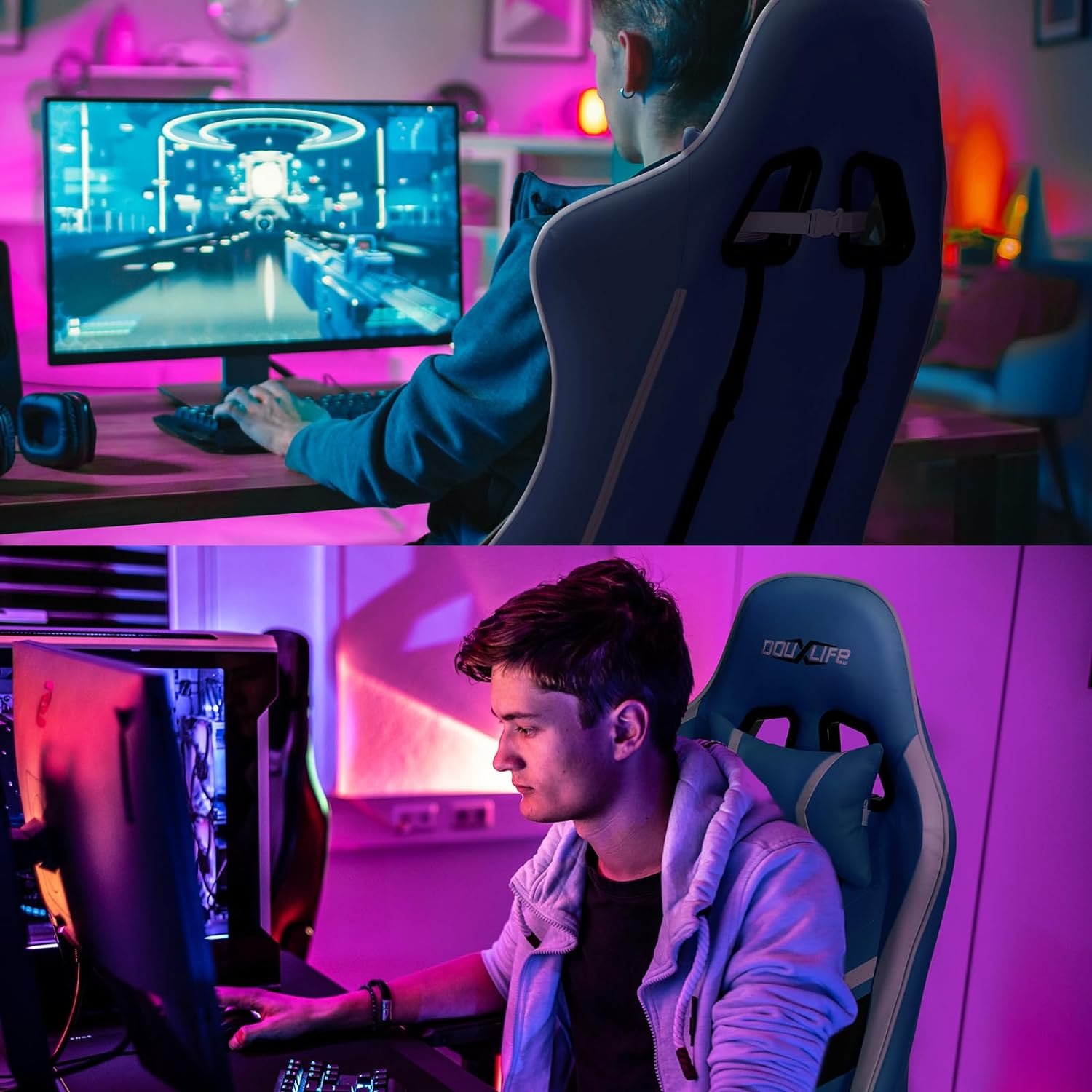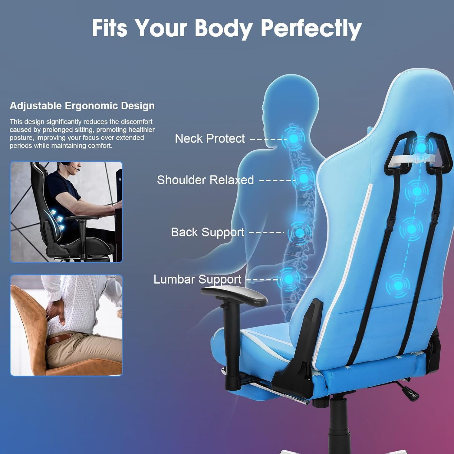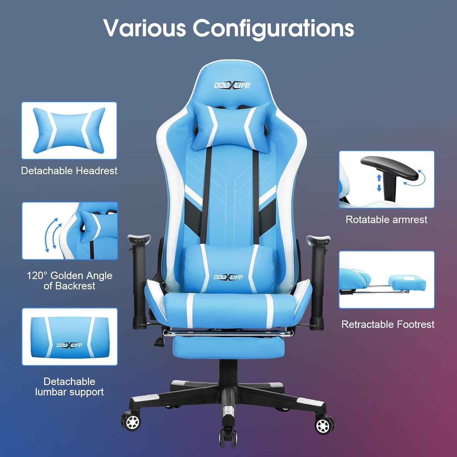Douxlife Massage Gaming Chair 7-Point, Office Chair with Footrest and Lumbar Support, Adjustable Seat Height Ergonomic, Thickened and Widened Cushions Backrest, 175° Reclining Max, Light Blue
