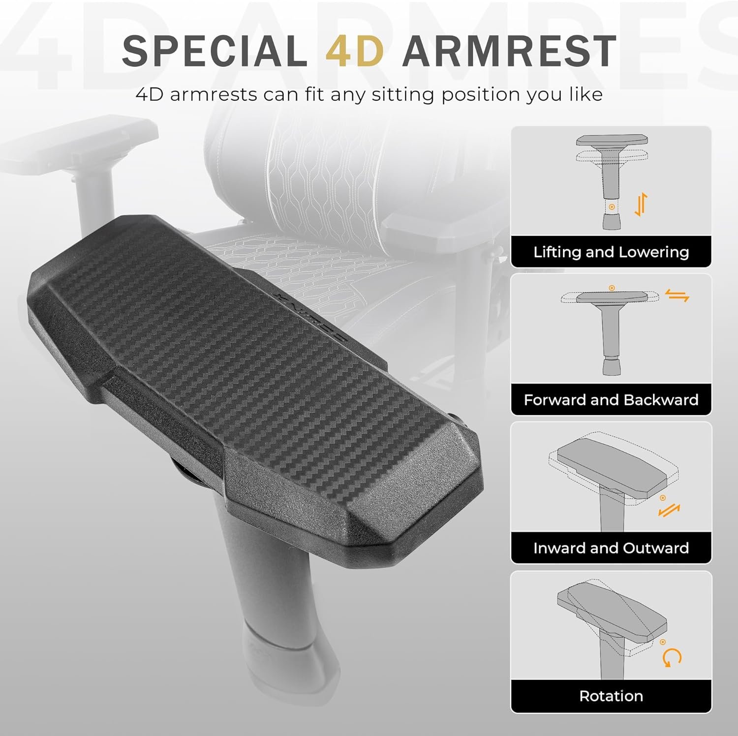 Upgraded 4D Armrests: This big and tall gaming chair uses Dowinx’s special 4D padded armrests, which can be adjusted front, back, left, right, up and down, and also have a swivel function. You can adjust to the most comfortable position based on your posture.