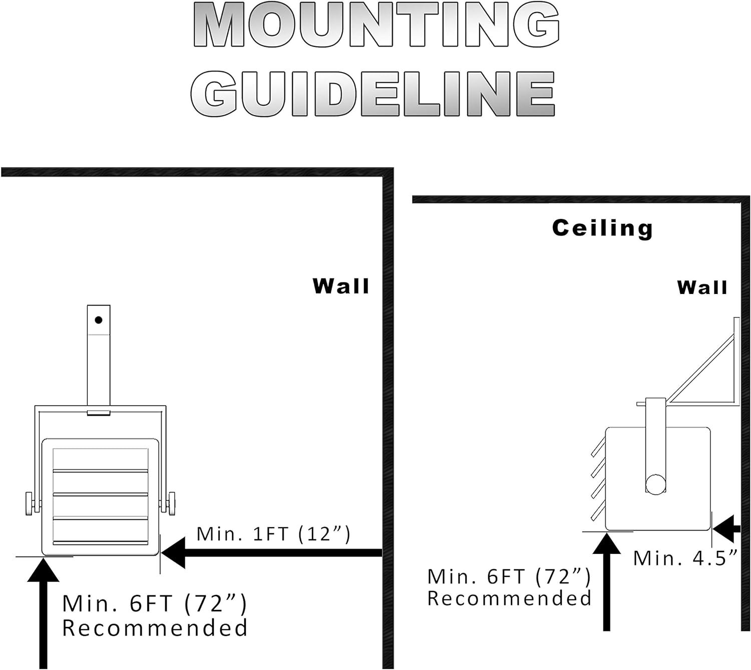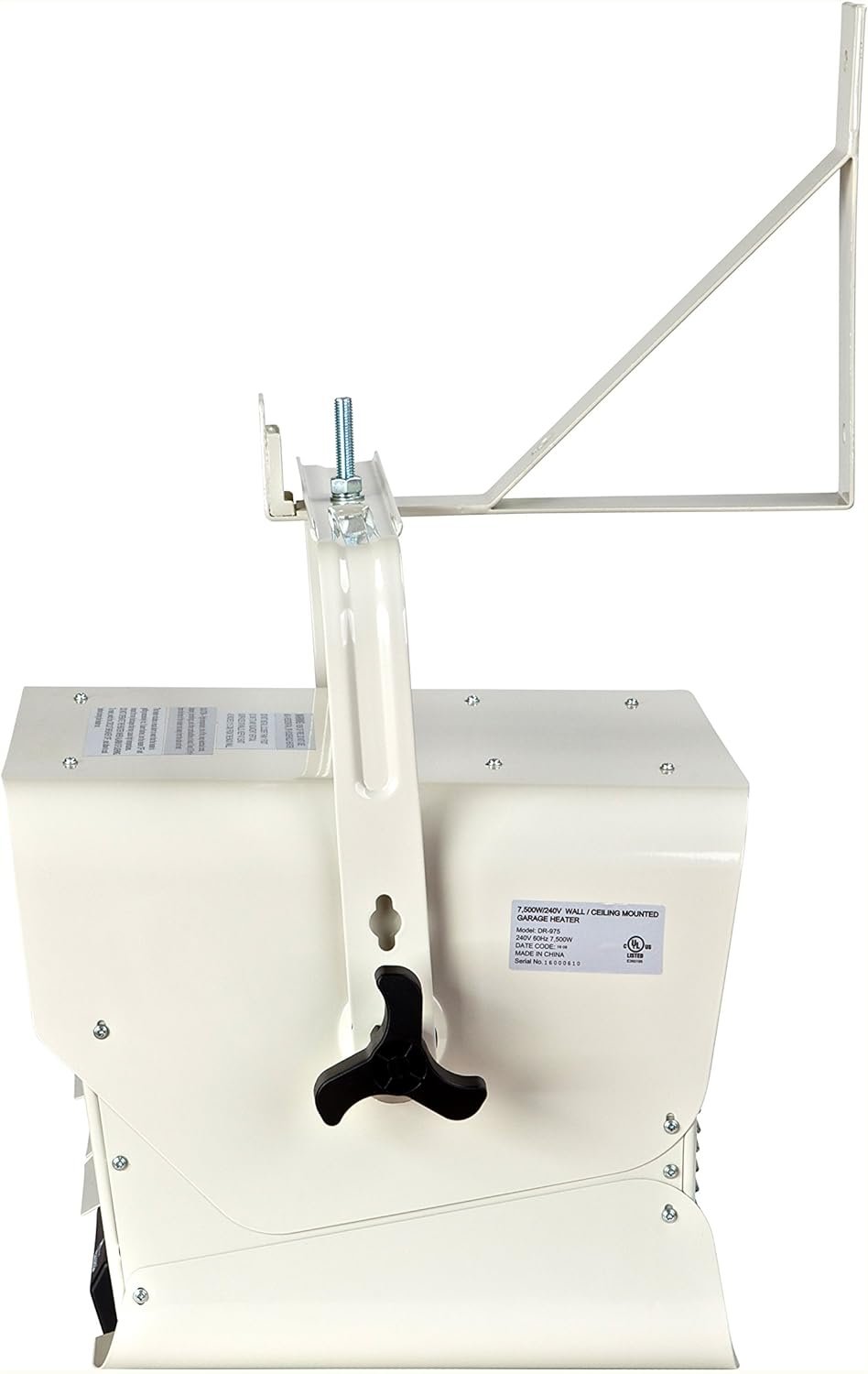 Need safe, comfortable, quick heater. Infrared heater DR-975 heavy-duty hardwired shop garage heater can be easily installed in your new or remodeled building. This 7500W heater can be the primary or auxiliary heat source ideally suited for use in garages, factories, stores, warehouses, workshops, Schools, churches, hospitals, dormitories, or any exposed spaces. The DR-975 uses spiral steel metal sheath electric heating elements with low sheath temperatures, providing uniform heat and long lasting product life. Additionally, a large, matched, dynamic fan provides maximum air flow with minimum Turbulence and noise, gently distributing warmth throughout your space. The heavy duty ball bearing motor is totally enclosed, thermally protected, and permanently lubricated, requiring minimal maintenance. Built-in adjustable remote-controlled thermostat allows you to set your desired temperature between 50 – 85 degrees. If desired, an optional wall-mounted external thermostat can be wired to this heater (sold separately, does not come with heater). rugged stamped steel front cover features five adjustable louvers for easy airflow control. Can be mounted on either the wall or ceiling (bracket included). finished in a grey epoxy paint. UL & CUL listed. 1 year limited component warranty.