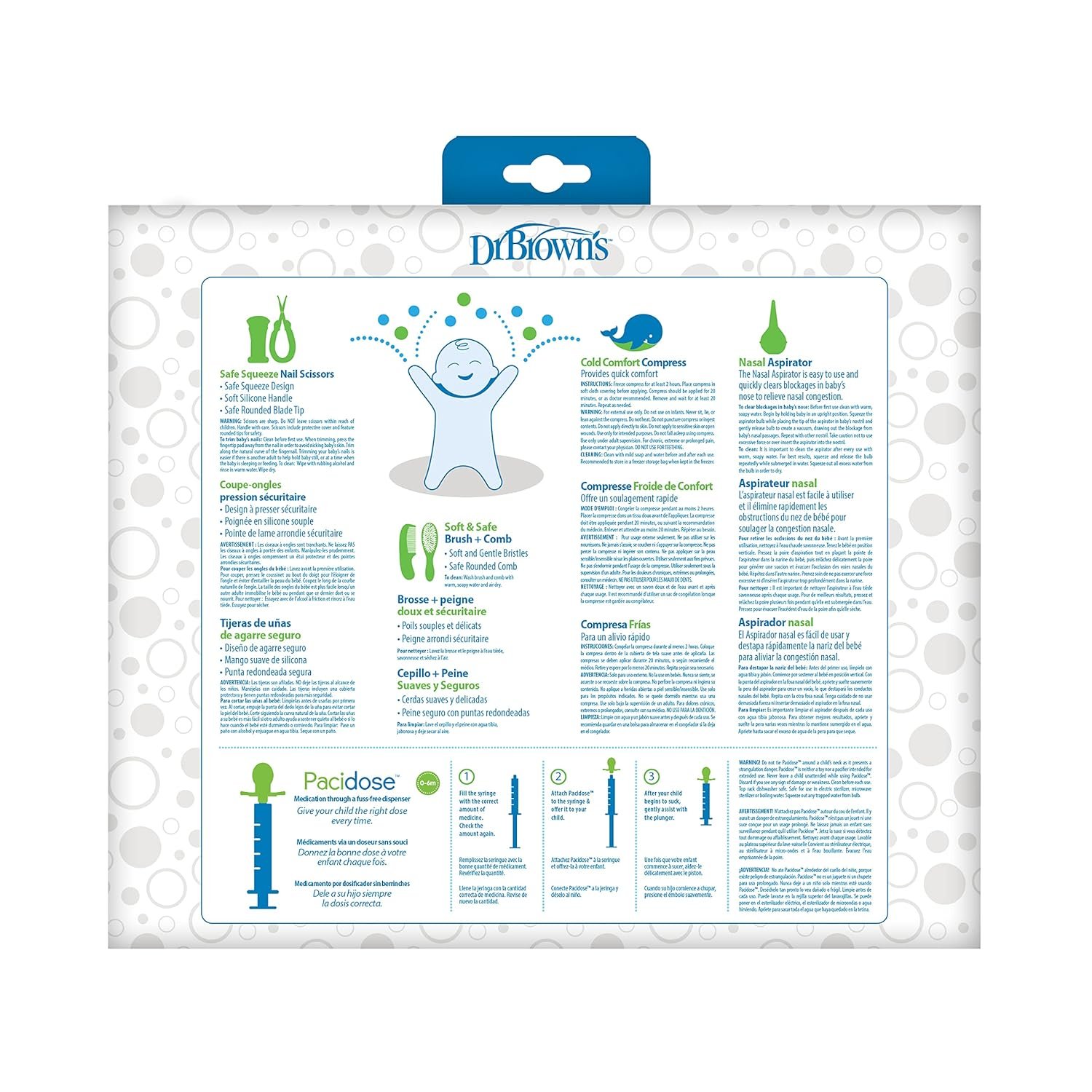 Dr. Brown’s Healthy Baby Essentials Kit contains all the essential items to keep baby happy and clean. The elegant, gender-neutral design is a perfect gift for parents-to-be – or to treat yourself! This 8-piece baby grooming kit includes Dr. Brown’s Safe Squeeze Nail Scissors, Soft and Safe Baby Brush + Comb, Nasal Aspirator, Cold Comfort Compress and Pacidose Liquid Medication Dispenser (0-6m). These high-quality items are lightweight and perfectly sized to use at home or on the go. This essential baby care kit will give you peace of mind while giving baby the top-notch care they deserve! All products are non-toxic and BPA free.