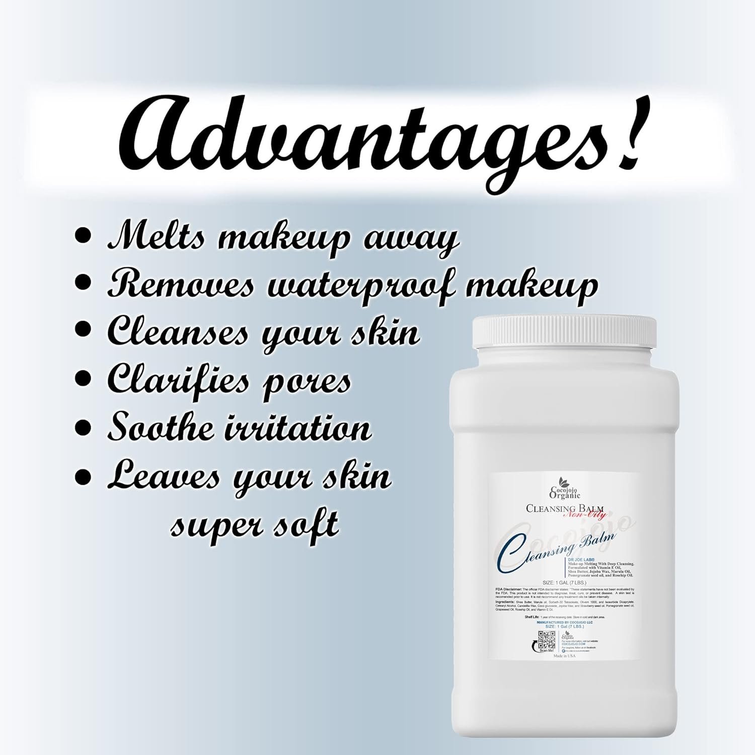 Common Name: Cleansing BalmBrand: Dr. Joe Lab.Liquid Volume: 1 Gallon (available in 2oz too).Product Advantages: Cleanser.Uses: Makeup Removal, Cleansing.Physical Form: Balm.
