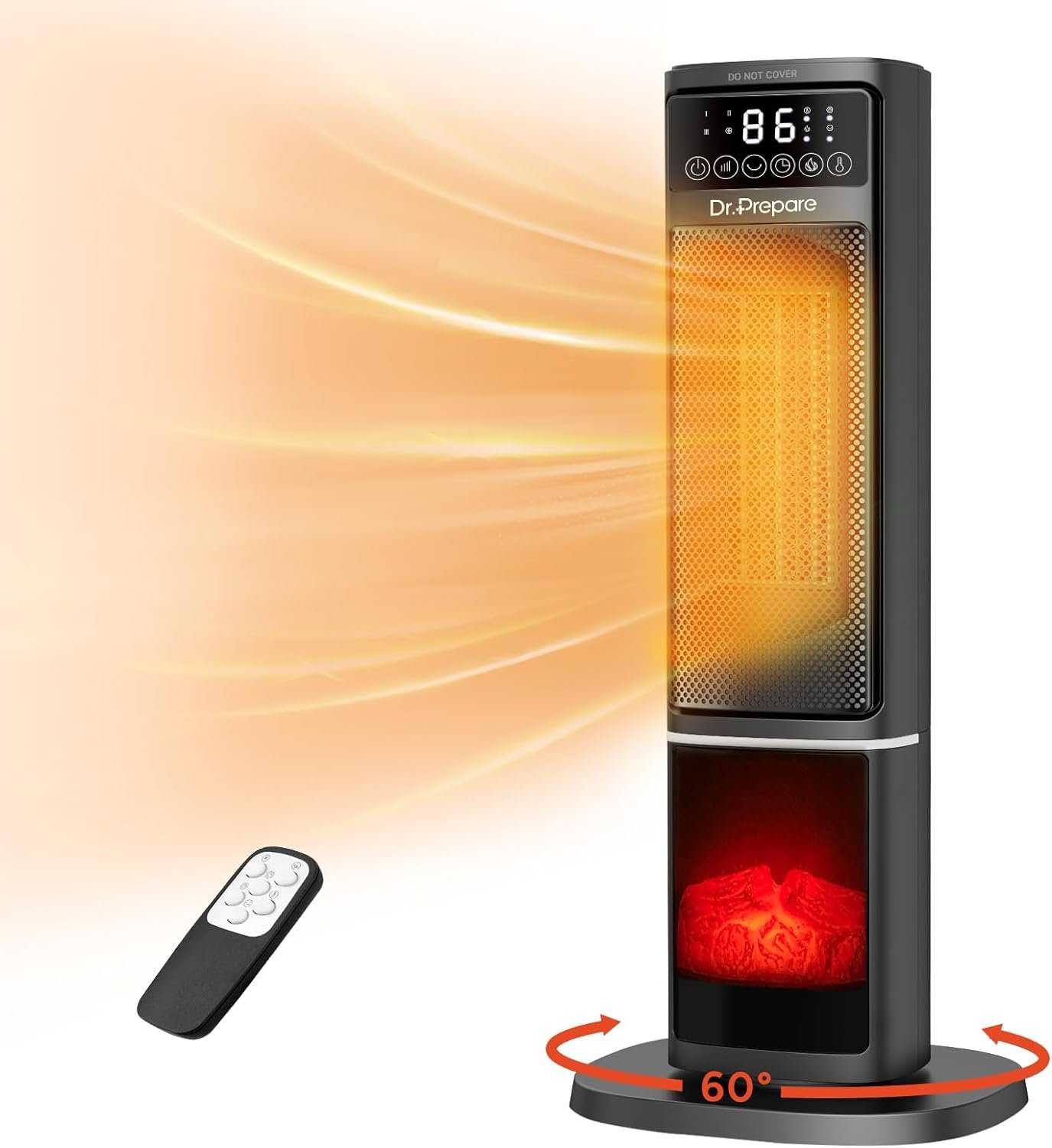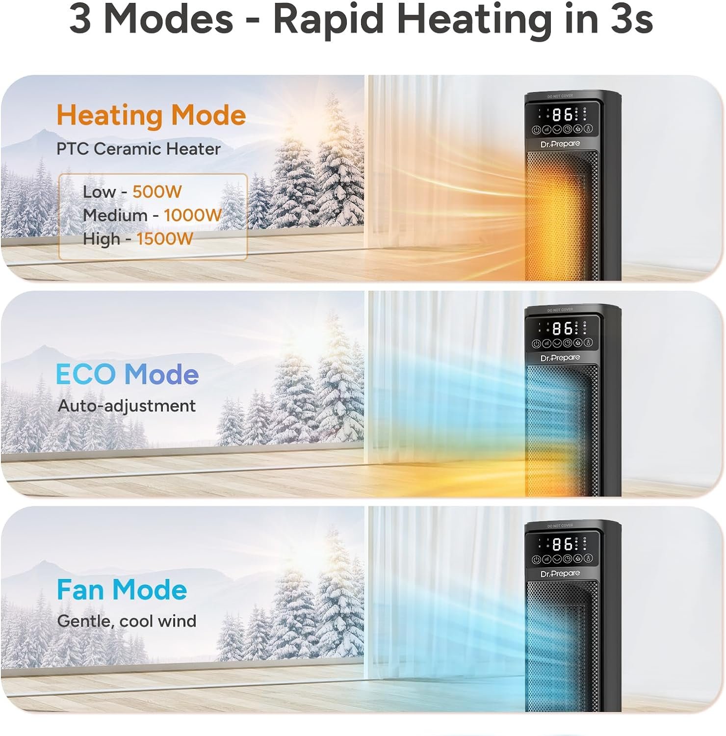 【3 Heating Modes & 3s Fast Heating】Dr.Prepare PTC ceramic heater is equipped with 3 Heating Levels – 1500W -1000W – 500W ( High – Medium – Low ), convienient to customize your own warmth. Within 3 seconds, this powerful space heater can rapidly heat up, thanks to advanced PTC ceramic heating technology. Let everyone feel cozy and toasty and sink into warmth in winter.