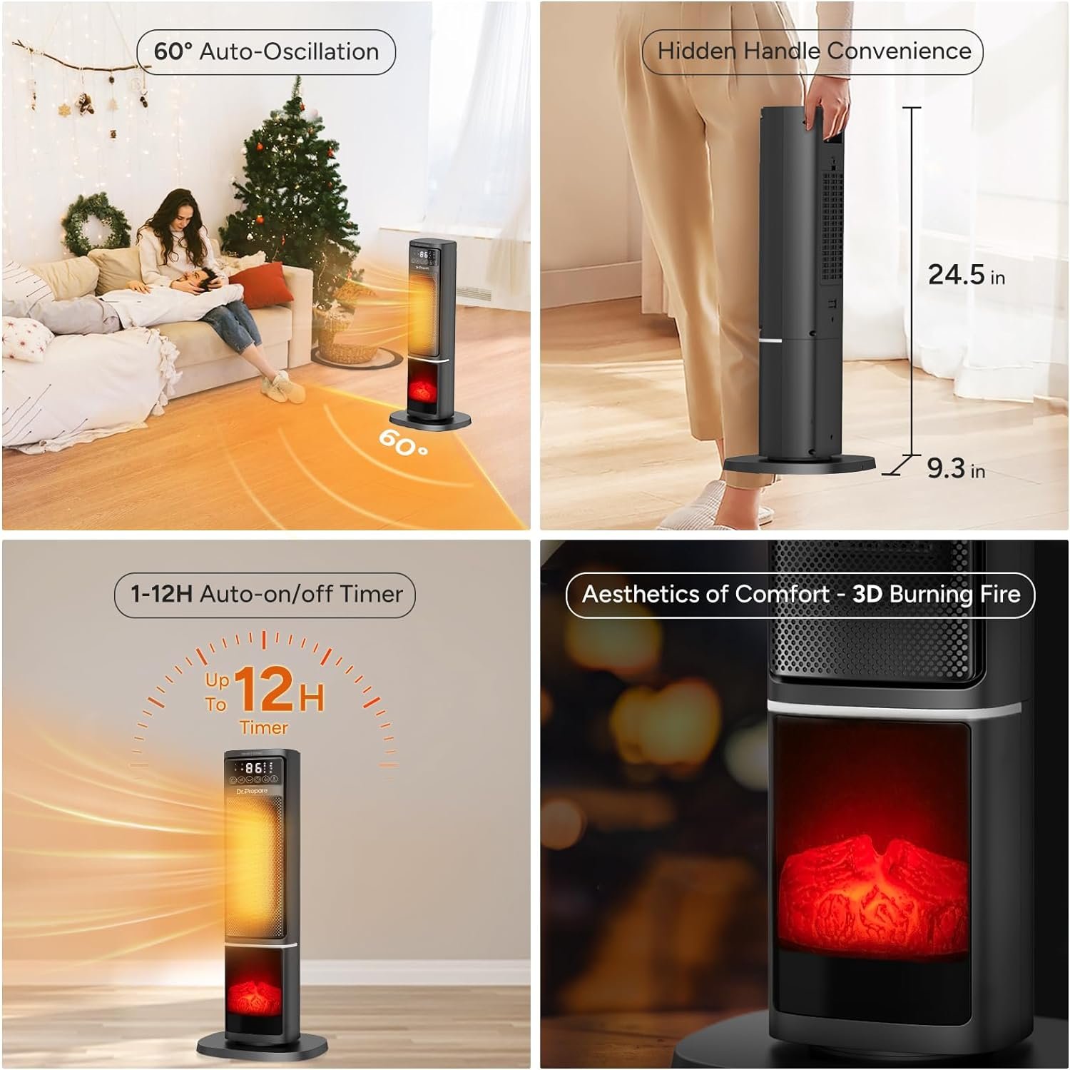 【Easy Assembly and Touchscreen & Remote Control】It jsut takes 1 miniutes to assemble the base to enjoy the 24.5 ft heater immediately. By touchscreen or remote, you can set heat levels, 1-12h timer, oscillation, 3D flame effect and temperature. The remote can control the heater within 23 feet (2 AAA batteries required, but NOT INCLUDED), perfect for bedroom, office, living room, dining room, garages, basements, house, home.