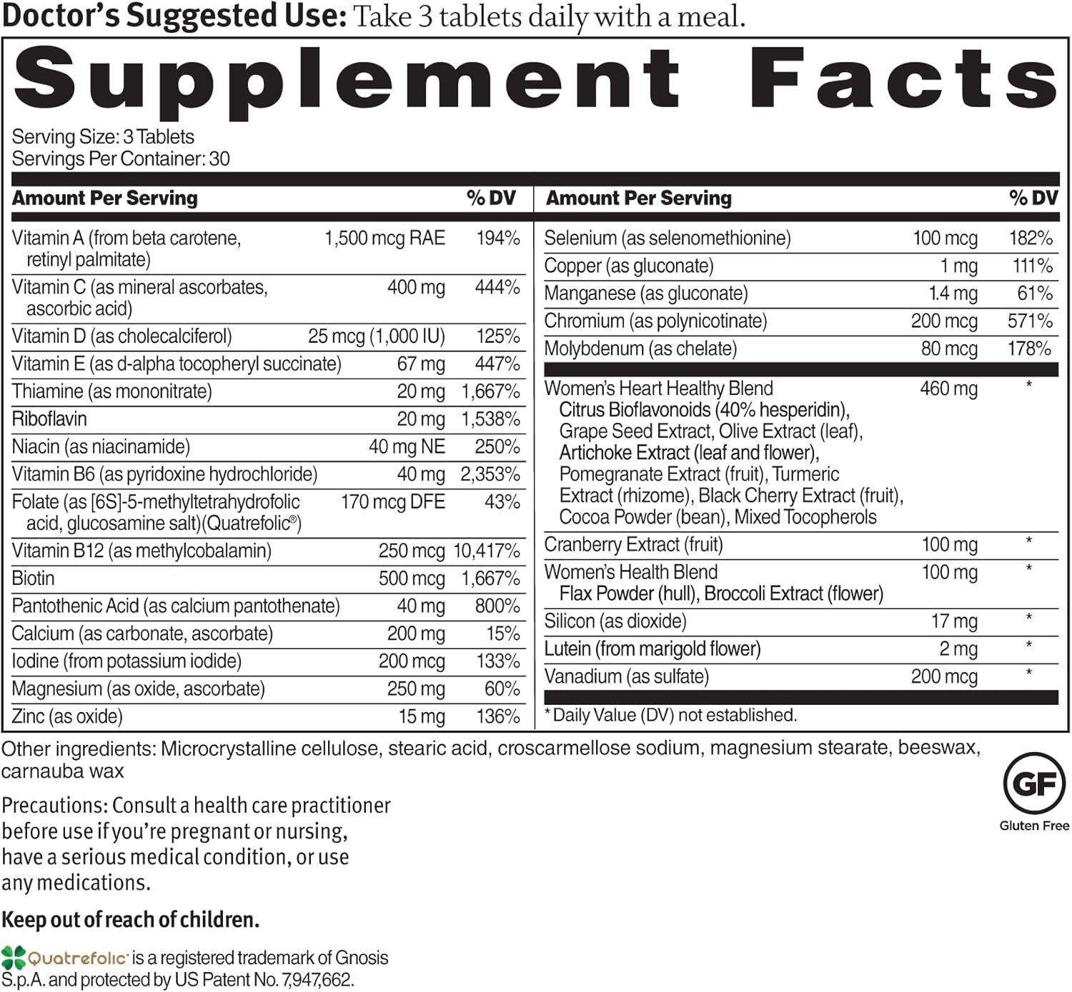 CARDIOLOGIST-FORMULATED WITH THE LEVELS OF NUTRIENTS A WOMAN NEEDS for optimal wellness, such as more calcium and magnesium to support bone health, plus other nutrients such as cranberry extract, flax lignans, and green tea for a complete formula for hormone, health, mood support, and metabolic health.