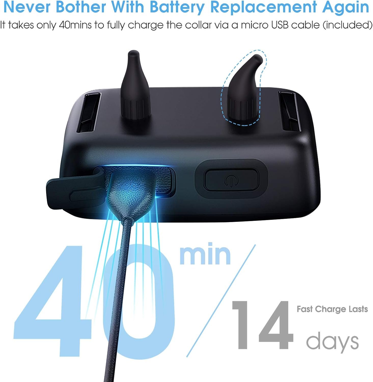 【40Mins Fast Charge & IP68 Waterproof】Anti barking collar can be fully charged rapidly in 40mins via a micro USB cable (included) from any relevant power source—PC, laptop, portable power bank, Android device charger, etc. Charging speed is 3X faster than others but also can work for half a month. The best waterproof allows your dog to run or play in splash water or rain, more convenient and safer dog barking collar