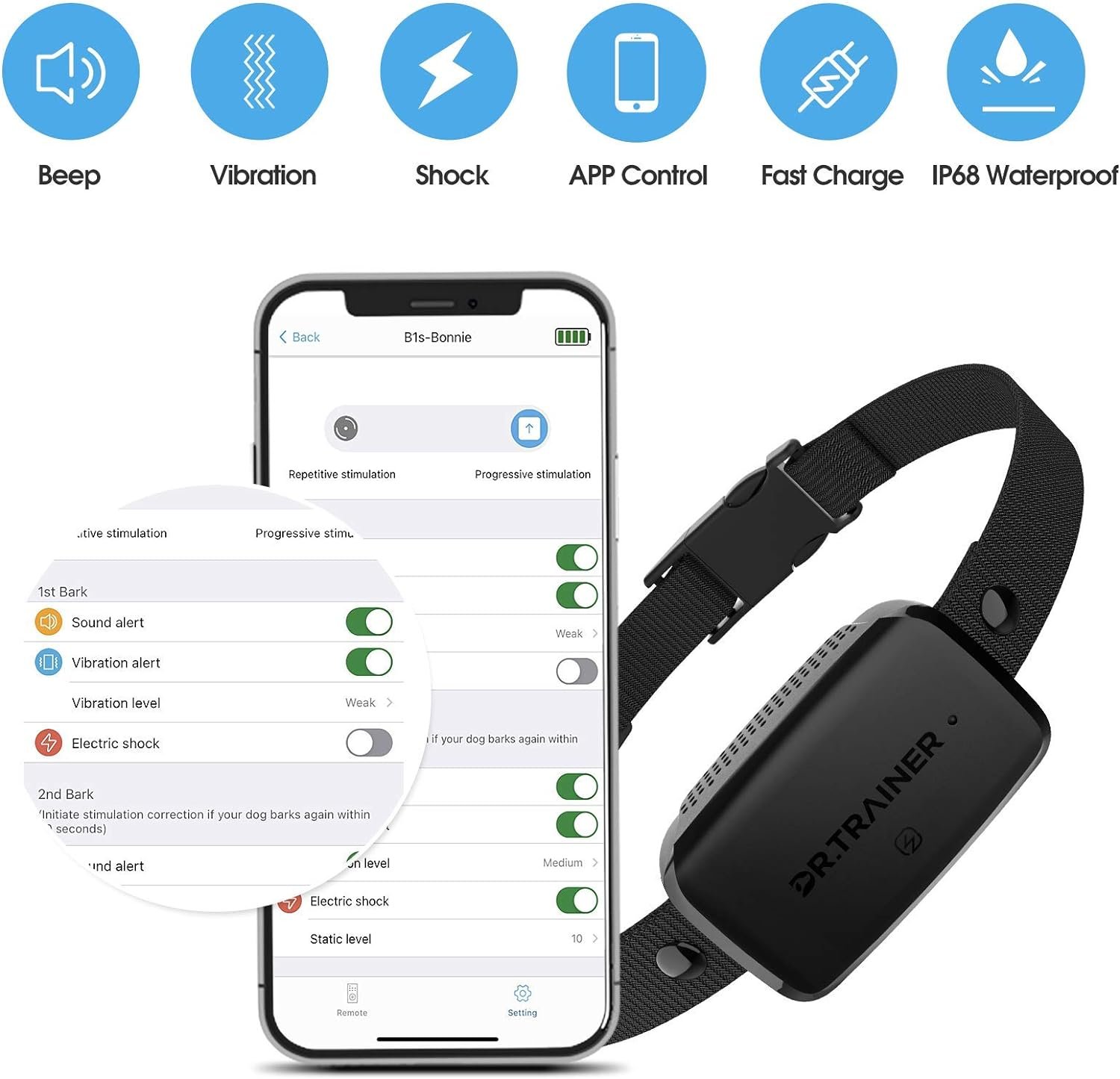 【Smart Progressive Correction & Intelligent Protection Mode】Troublesome to adjust complex parameters according to the manual and inconvenient to change the levels when your dog wears it? The B1s dog shock collar updated it, you can adjust Each Level, freely combine and set each parameter on the APP. For the safety of your pet, our humane bark collar will be deactivated for 2min if this bark collar is triggered 10 times within 1min