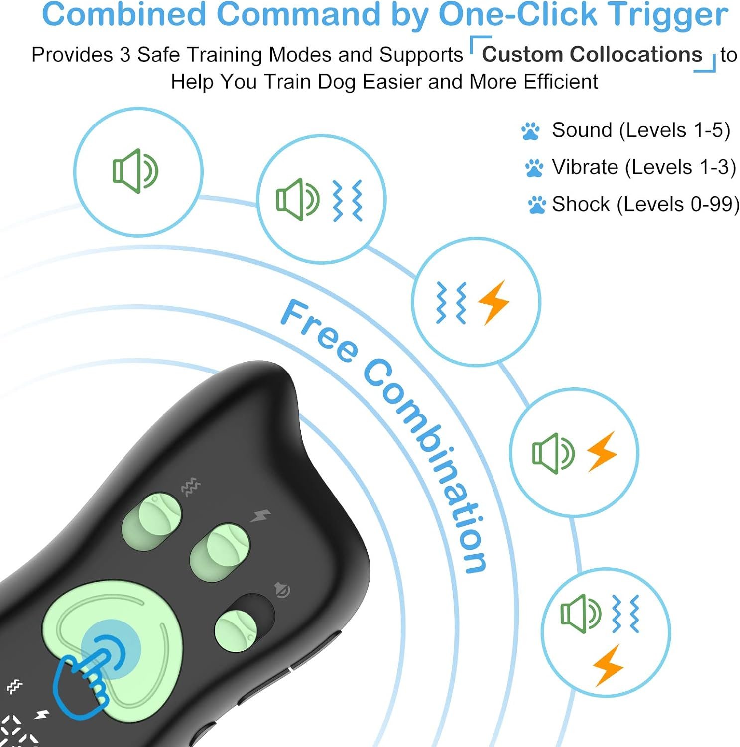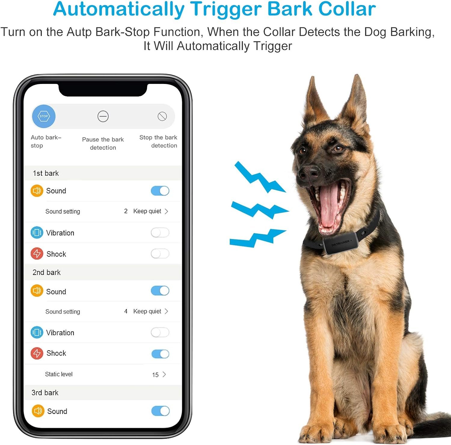 【Bark Collar for Dog with Remote】Offers 3 adjustable safe modes (custom sound, vibration, and shock) to train your dogs; Freely combine the 3 modes and adjust intensities through the APP to customize an exclusive training plan for your dog. More scientific and effective teaching basic commands, and correcting the annoying habits such as barking, chewing, biting, and digging.