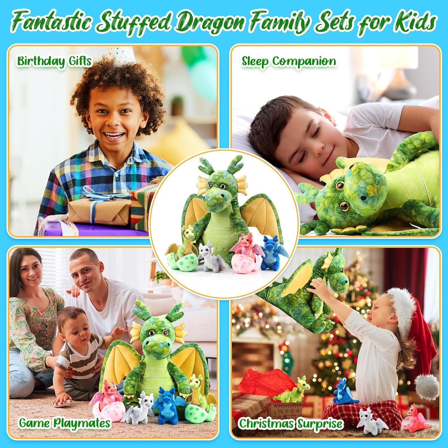 Dragon Stuffed Animals Set with 15.75″ Large Mommy Dragon Stuffed, 4 Babies and 2 Dinosaur Eggs Plush Zippered Belly Dragon Toys Gift for Kids Girl Boy Birthday Christmas