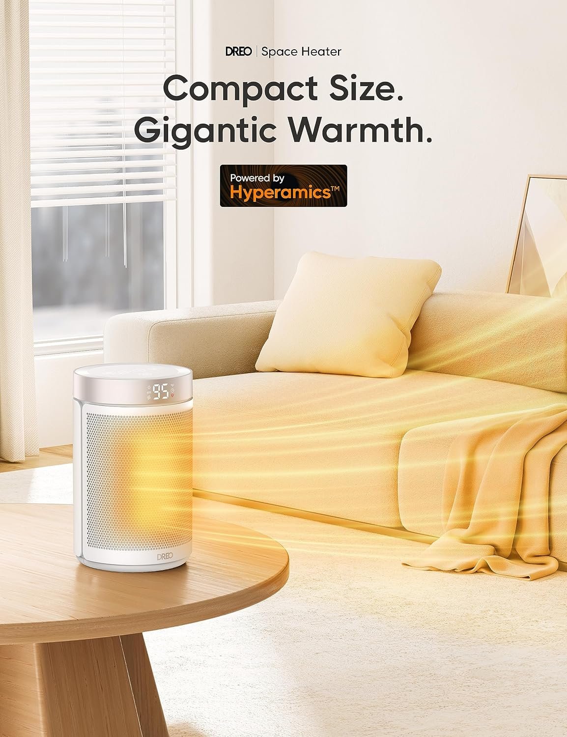 Product 2: Powerful heat that fits everywhere: Dreo space heaters for indoor combines Hyperamics 1500W advanced PTC system with a new heat funnel design to deliver heat within seconds and enhance warm air circulation for up to 200% farther reach than traditional heaters.