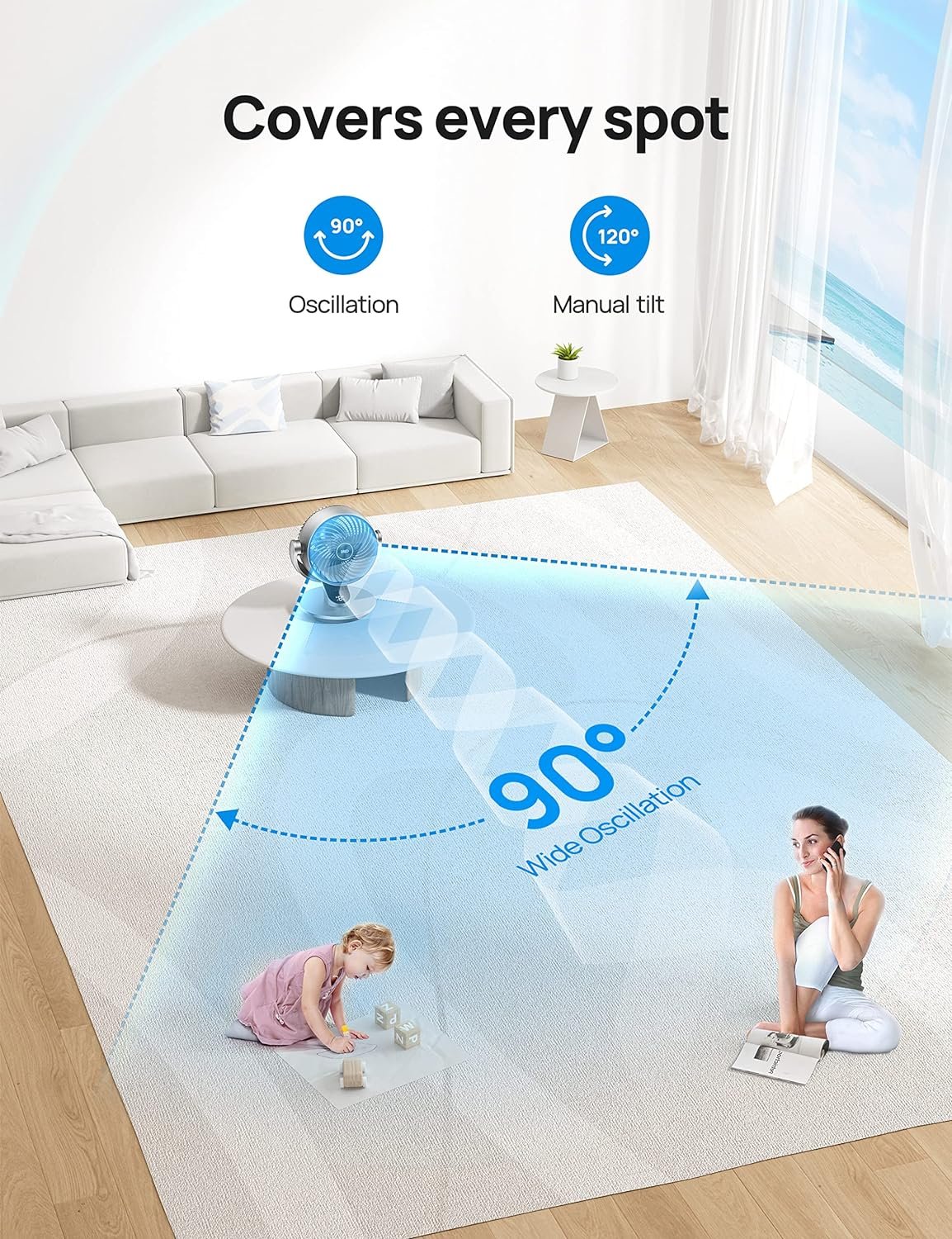 Omni-directional oscillation for 150 ̊ horizontal and 120 ̊ vertical airflow to customize and bring comfort to each space.