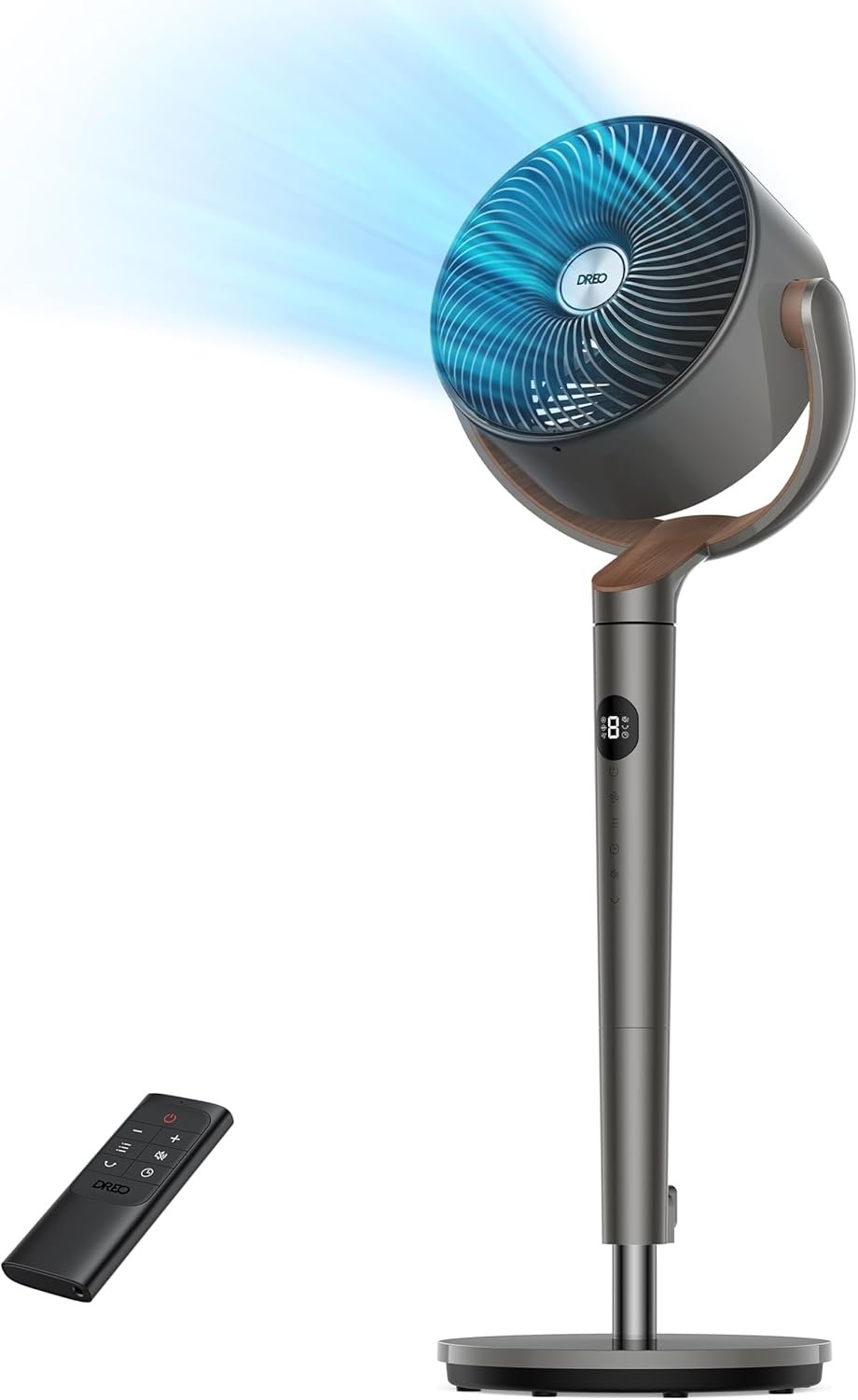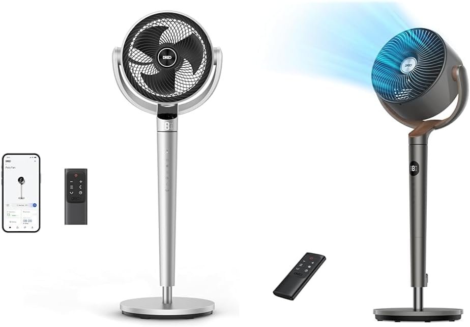 This bundle includes two powerful and quiet Dreo pedestal fans to keep your home comfortable. The first fan features 9 speeds, 6 modes, 150° horizontal and 120° vertical oscillation, and smart controls via app, voice, or Alexa for customized cooling. Its brushless DC motor circulates air up to 110 ft. at an ultra-quiet 25dB. The second fan also offers strong whole room air circulation up to 80 ft. Its 120°+120° oscillation ensures coverage for large spaces. With 8 speeds, 3 modes, and a noise level of 23dB, it provides flexible cooling options without distraction. Both fans have adjustable heights and built-in timers for convenience. The broad functionality of these fans complement each other to meet all your cooling needs. Use the smart-enabled fan for bedroom while relying on the powerful manual fan for living areas. Or place one fan on each level of your home for whole-house air circulation. With their whisper-quiet operation, wide oscillation, and range of speeds and modes, this bundle keeps you comfortable in every corner.