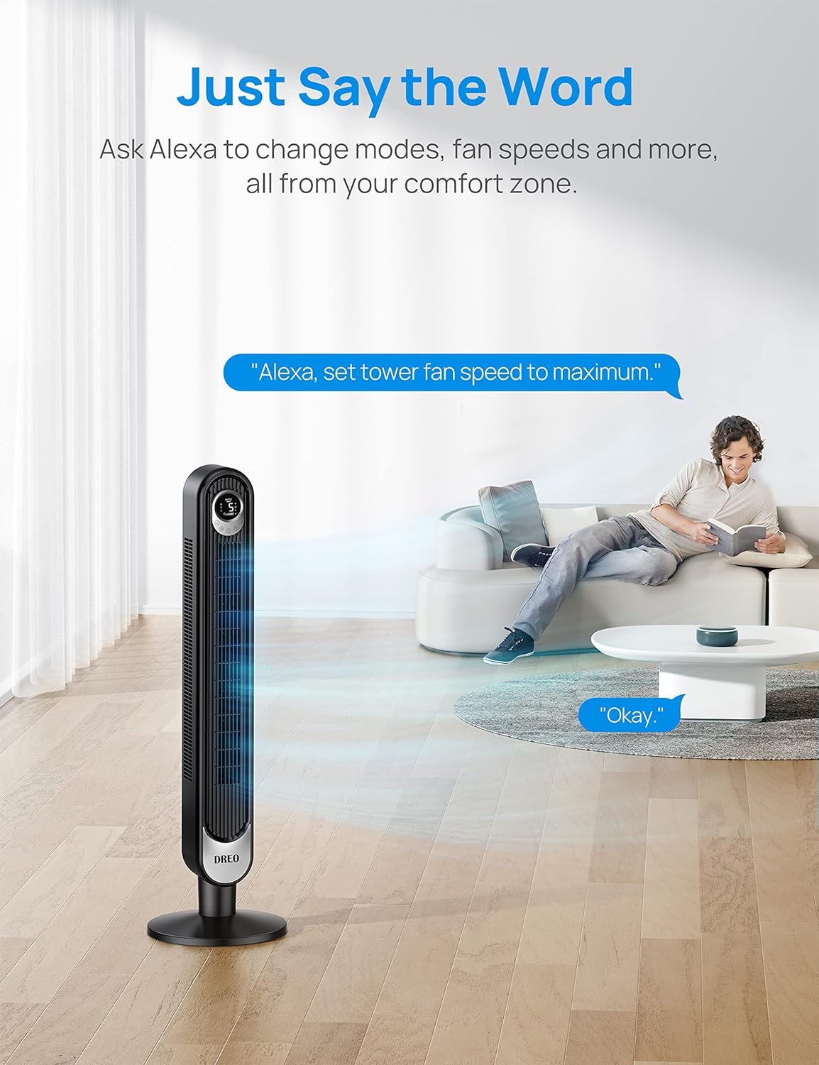 Safe and Reliable: This ETL certified WiFi tower fan is safe for your family. The bladeless fan creates powerful airflow without fast spinning blades. The safety design prevents children and pets from putting fingers and paws inside Portable Carrying Handle: Comes with a built-in carrying handle for easy movement. The remote control can be placed inside the handle for your convenience Four Modes: Customize your breeze with four modes – Sleep, Normal, Natural, and Auto Mode. Stay cool on hot summer days in the bedroom, study, living room, dorm or office 12H Timer: Automatically turn off the WiFi tower fan by setting the 12 hour timer in 1 hour increments, saving unnecessary energy consumption MUTE Function: Turn the beep on or off by pressing the ‘MUTE’ button on the Dreo APP or the remote control for a good rest